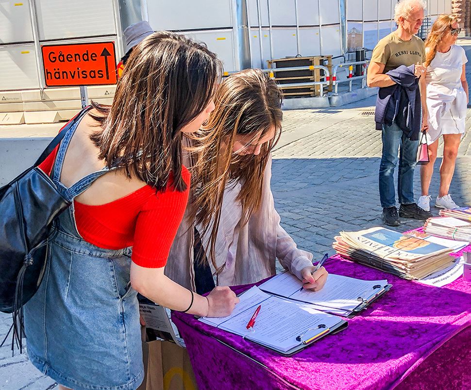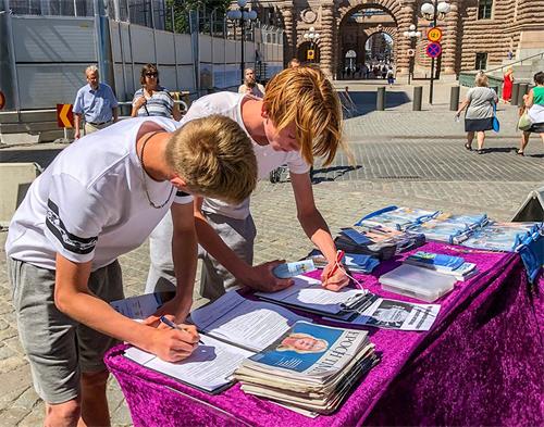 当天来听法轮功学员讲真相的还有很多二十多岁瑞典的年轻人,他们得知自己在自由民主国家长大成人的这段时期,中共竟然用如此残暴卑鄙的手段迫害修炼“真、善、忍”的善良民众,而且这场迫害已经持续了二十多年了,很是震惊、气愤。了解了真相后,他们都主动签名,以此来表达自己制止迫害、支持正义的心愿。