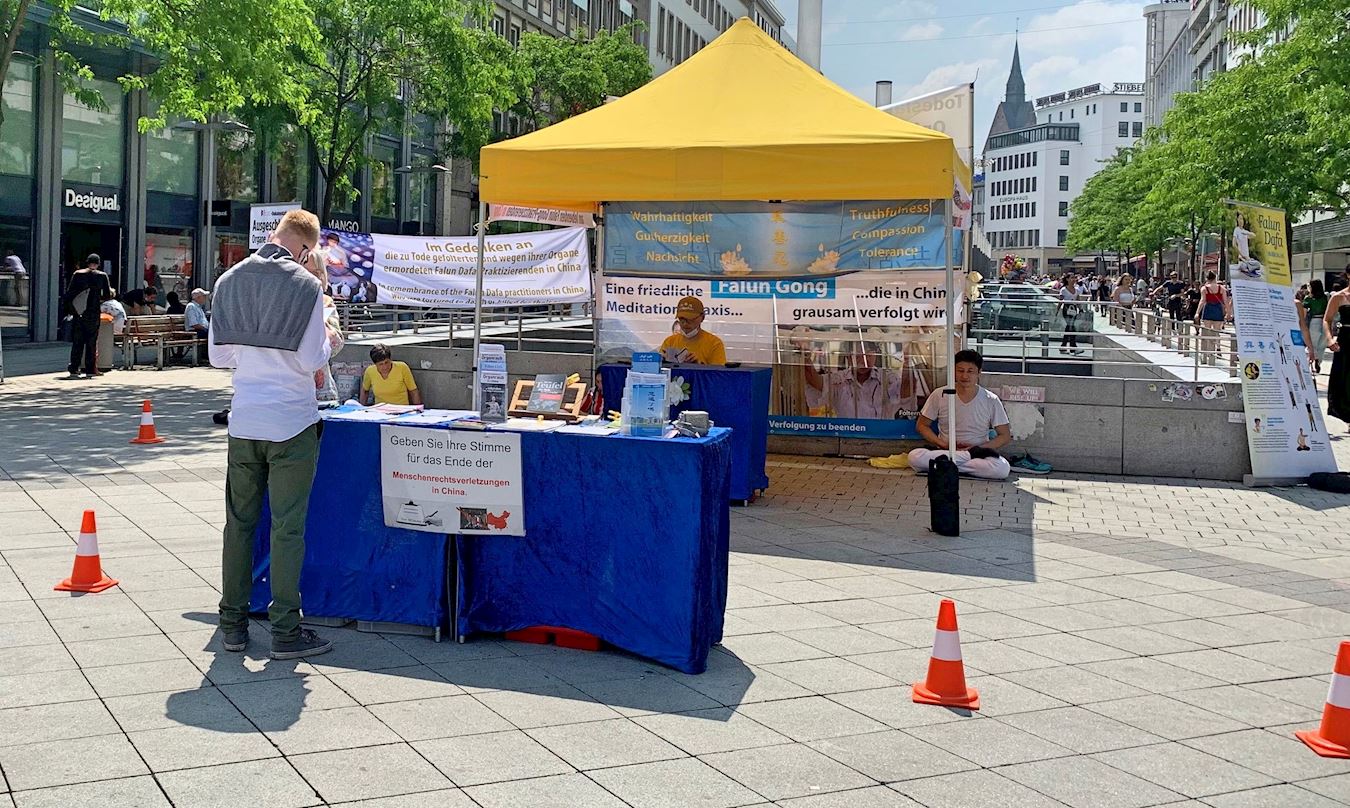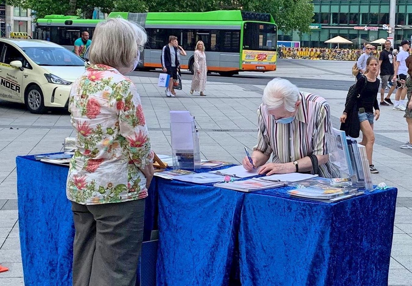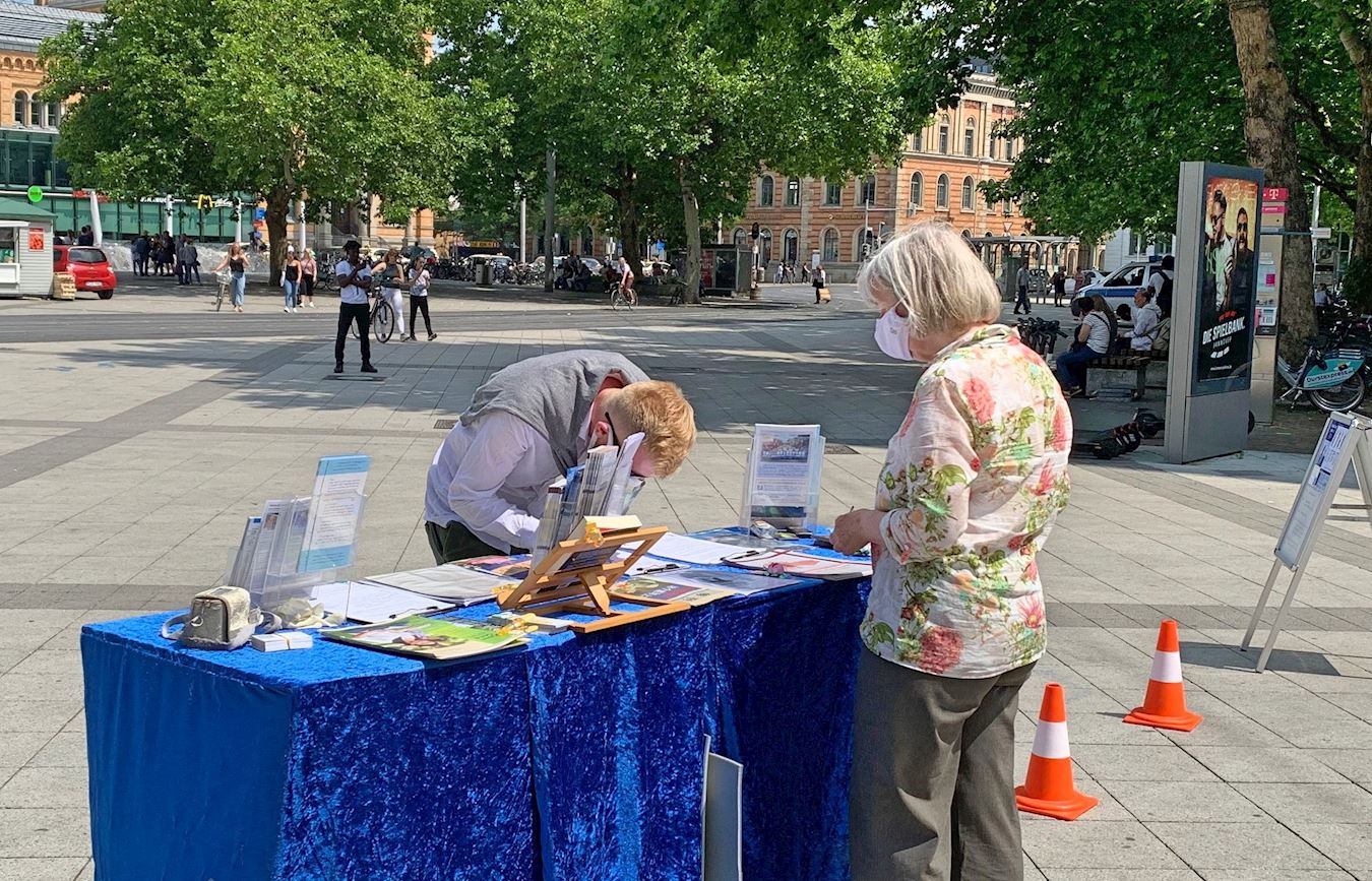 ![]() 图1~4:二零二零年六月十三日,德国汉诺威学员举办信息日,过往民众在信息展位前了解真相,并在制止活摘器官的请愿书上签名。 |