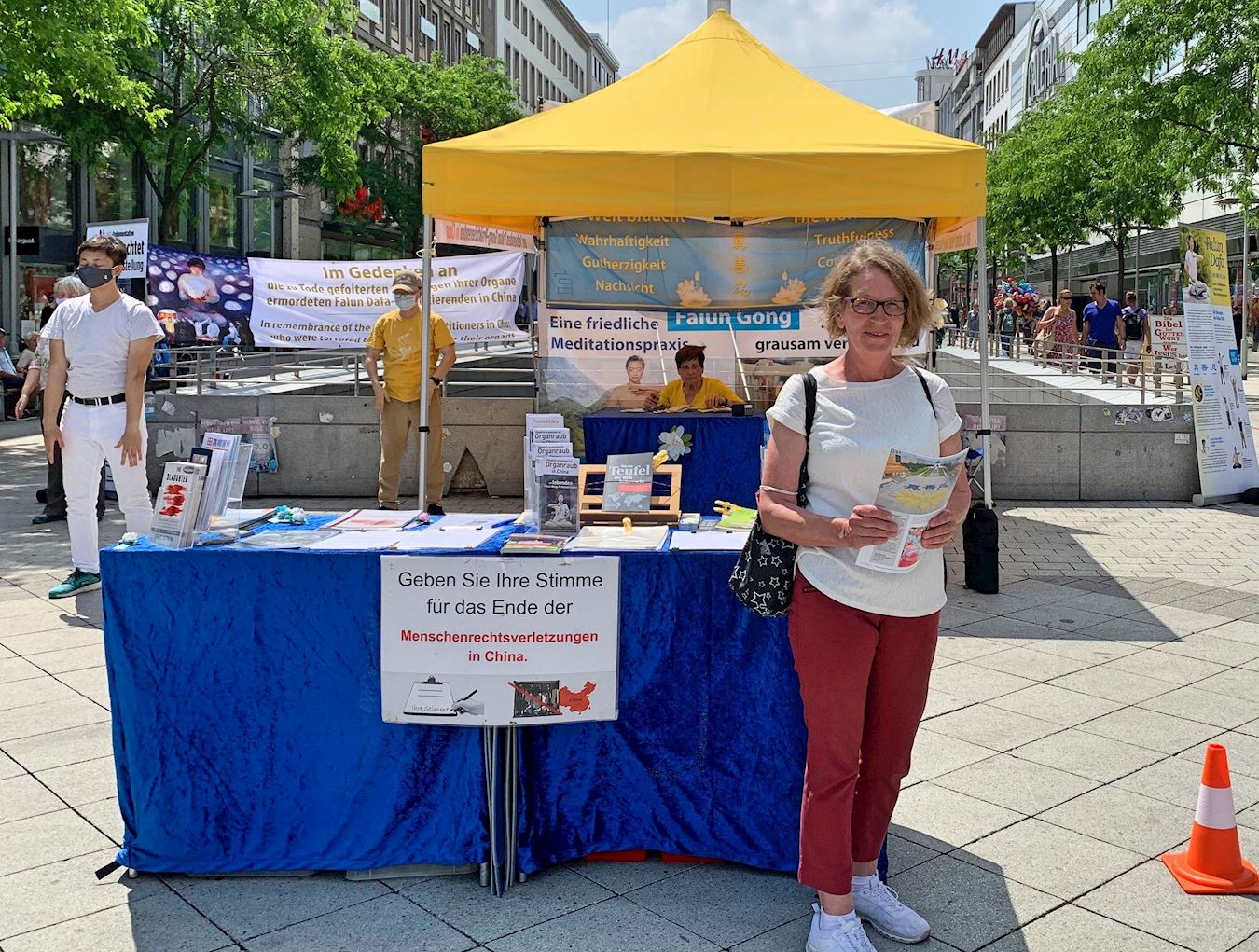 一为退休前曾为护士的女士来到展位前、在征签板上签名。她表示看到发生这样的事情(中共活摘法轮功学员器官)让她感到很难过。她之前也有听说过这场(在中国发生的对法轮功学员的)迫害,她阅读过许多相关的内容。她说:“这是在犯罪,这违反了人权。”她希望这场迫害可以尽快结束。离开之前她对学员说:“我祝愿您一切都好。”