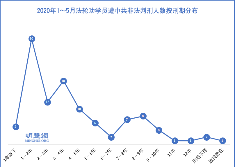 ![]() 图2:2020年1~5月法轮功学员遭中共非法判刑人数按刑期分布 注:1~2年(1年或1年以上,2年以下,余下类推) |