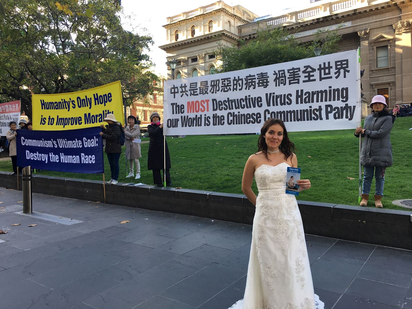 安吉拉(Angela)六月二十日在州立图书馆附近拍摄婚纱照,法轮功学员的和平请愿让她驻足拍照。她说:“自从看过有关活摘的几部纪录片后,我和丈夫就非常担心法轮功学员在中国的安危。中共是反人类的,中国人没有一个安全的政府来领导他们,我认为澳洲和西方的政府应该想办法制止迫害,保护中国民众。”