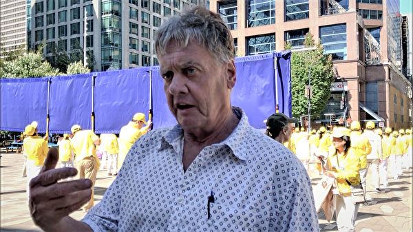 路过的彼得(Peter)说:“我觉得这些法轮功学员都非常平和,非常善良,我最欣赏的就是他们打的横幅——天灭中共,因为中共干的事太坏、太无耻了。把做好人的法轮功学员抓起来迫害,还强摘器官,卖钱牟利,这都不是人干的事。中共还强推香港国安法。想到这些中共的罪恶,有时要掉眼泪。共产党就应该灭亡,从地球上消失。”