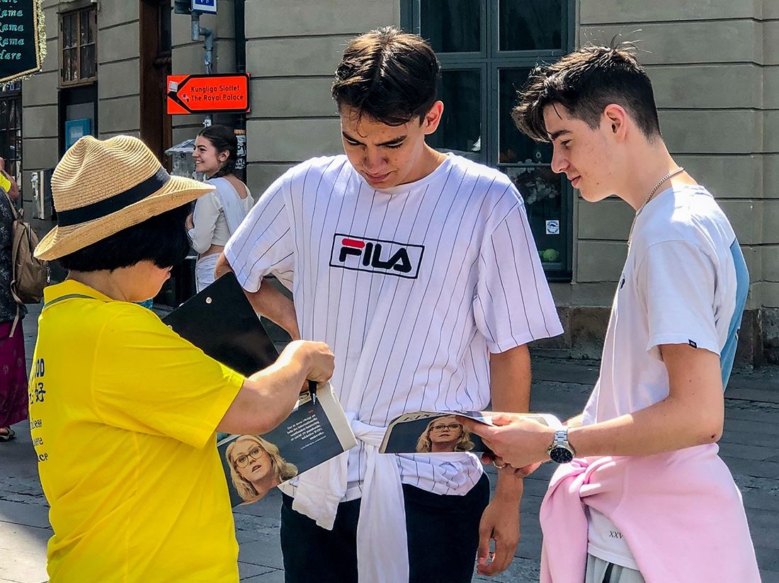 有四位来自印度的年轻人,目前在斯德哥尔摩工作。经过学员的活动场地时,他们得到了大法真相传单很是开心,立刻打开传单阅读,并问学员:“什么是法轮功?中共为什么要迫害法轮功?”他们带着很多的问题和学员交谈了很久,法轮功学员耐心一一解答。临走时他们得到了所有英文的法轮功真相资料后,才满意地离开。