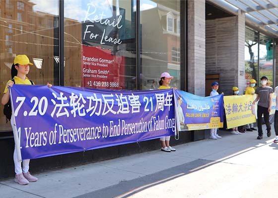 大多伦多地区的法轮功学员7月17日在市中心、密西沙加市、士嘉堡区和万锦区繁忙的40多个路口拉起真相横幅,给民众传递真相。