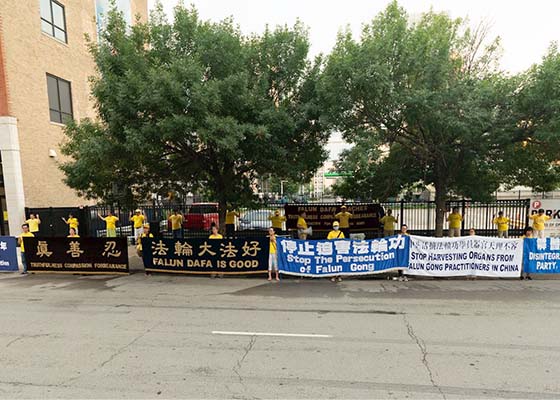 美国大芝加哥地区部份法轮功学员7月18日在芝加哥中领馆前,悼念被中共迫害致死的中国大陆同修,揭露中共21年来对法轮功的残酷迫害。