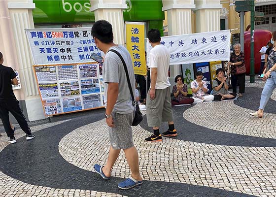 七月十二日下午,澳门法轮功学员在市中心步行街进行集会,要求解体中共,停止迫害。同时悼念被迫害致死的法轮功学员。