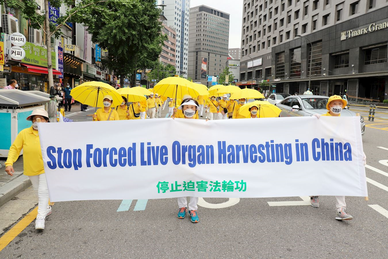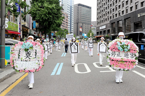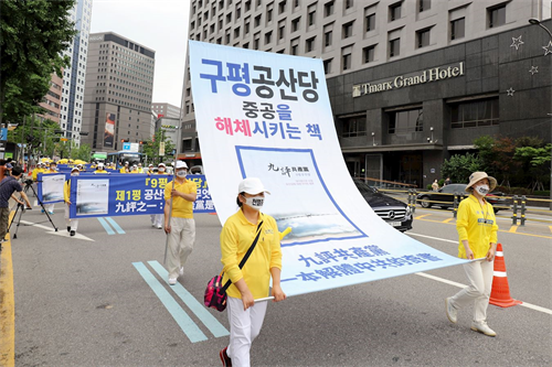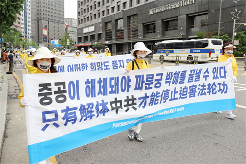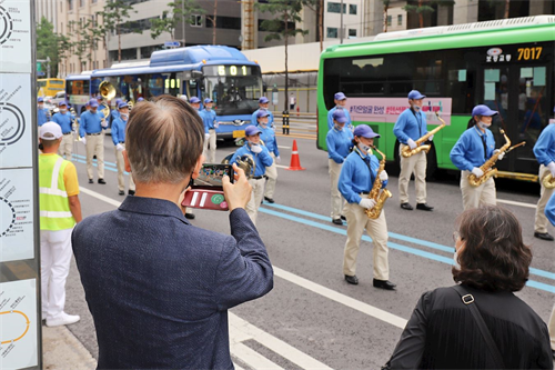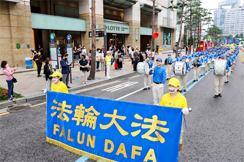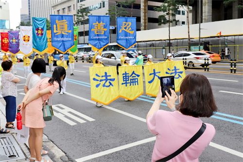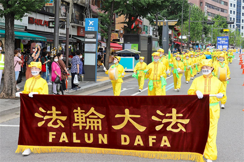 由法轮功学员组成的天国乐团,踏着威风凛凛的进行曲打头阵,展示法轮大法、真善忍的大旗,以及法轮大法大型横幅的游行队伍浩浩荡荡,身穿金黄色炼功服的炼功示范队伍,向首尔市民展示了优美的炼功动作,尤其是美丽的仙女队在花车上演示炼功的情景,令很多人驻足观赏,并纷纷拍下照片和视频,当时的场面俨然一道亮丽的风景线,为梅雨季节灰蒙蒙的首尔街道带来光明。