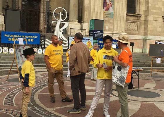 2020年7月18日,匈牙利法轮功学员在布达佩斯地标之一的大教堂前,圣安德斯万广场上举办了反迫害讲真相和烛光悼念活动。
