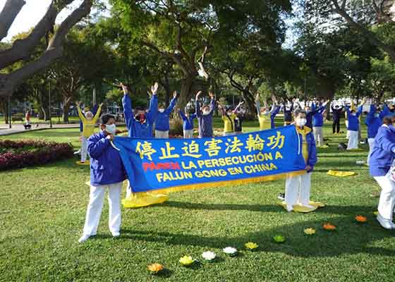 七月二十日下午,秘鲁首都利马法轮功学员在中共驻秘鲁大使馆前的公园内举办活动,抗议中共迫害法轮功,呼吁解体中共,停止迫害。