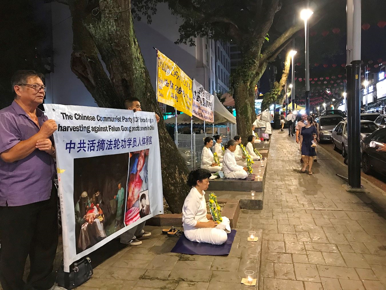 七月十九日晚上,部份法轮功学员在吉隆坡最有名的观光点小吃街——亚罗街(Jalan Alor),悼念被中共迫害的法轮功学员。学员挂起“法轮大法好,真善忍”、“全球声援中国民众控告江泽民迫害法轮功”横幅,也有学员举起“中共活摘法轮功学员人体器官”图片横幅,揭露中共暴行,让更多的世人了解真相,帮助制止迫害。