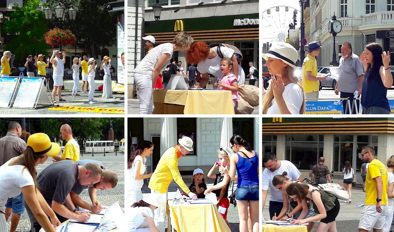 上午十一点左右,学员们有的在派发真相传单,并且对民众讲述修炼真善忍的法轮功学员在中国大陆被残酷迫害,被强行活摘器官的真相,征集反迫害签名。更多的学员在展示法轮功功法。明白了法轮功真相的民众,纷纷前来签名表示支持法轮功学员反迫害反对活摘。