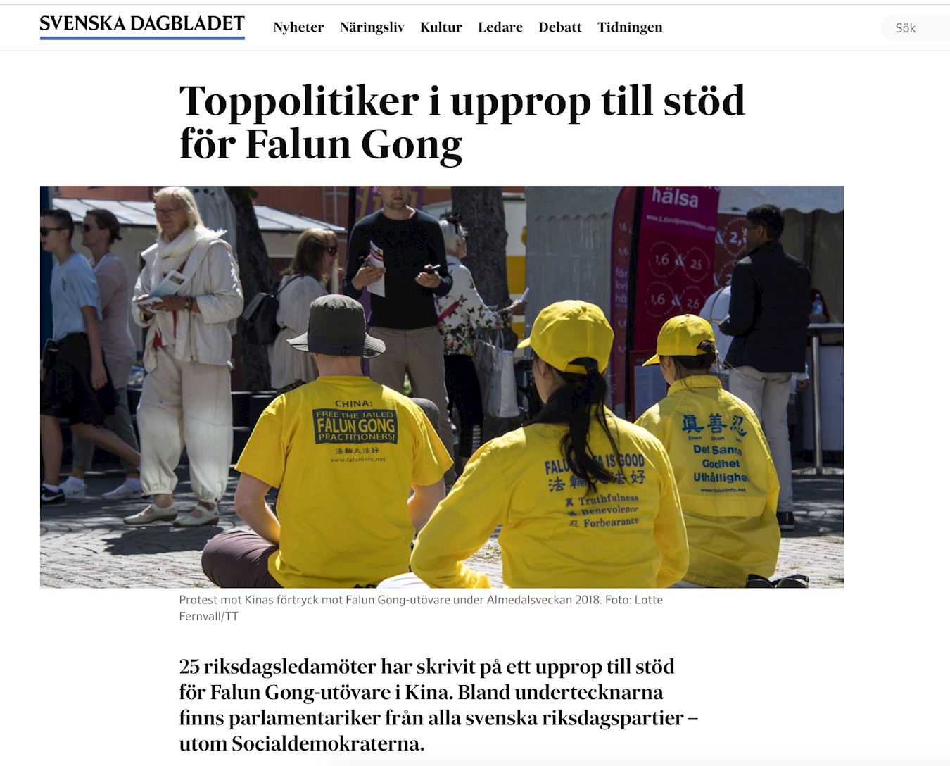 ![]() 图4:瑞典第二大日报瑞典日报(SvD)以“顶级政要呼吁声援法轮功”为标题报导了联合声明。 |