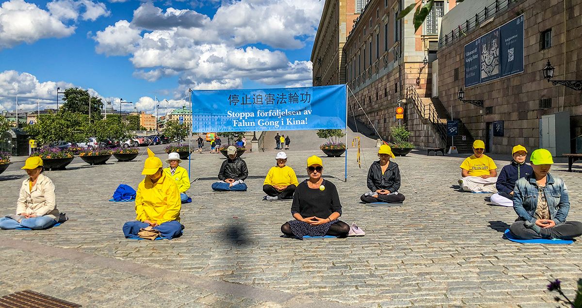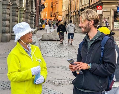 一位穿着讲究的瑞典老妇人,早已了解法轮功真相,每次当遇到法轮功学员在这里办活动时,她总是站在一旁,静静地观看学员炼功、演示功法。今天,她走上前流着泪对学员说:“我特别的同情你们,这么多年了你们受了那么多的罪,还是那么的平静、祥和,这(法轮功)是那么的美好!”她不停地擦着泪,继续站在那里观看学员炼功。