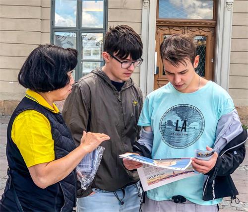 有两位在英国留学的年轻人,看到法轮功学员在这里讲真相很是高兴。他们签名表示支持法轮功学员反迫害,用英语和学员交谈,对学员说:“中共迫害法轮功、活摘法轮功学员的事实真相我们都知道,对中共干的这些坏事很了解。我们非常支持你们能站出来办这样的活动。”