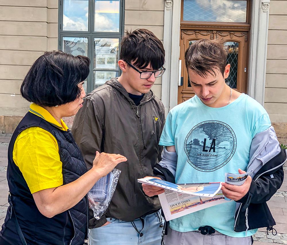 二零二零年七月七日星期二下午,阳光灿烂、天气非常的好。斯德哥尔摩法轮功学员与往常一样,在钱币广场上举办讲真相活动。路过广场的人们被法轮功学员展示的功法演示所吸引,不少路人驻足观看、拍照。在真相展板前总是有人站在那里仔细阅读,在了解了法轮功真相之后,就有人表示感兴趣,要到炼功点学炼法轮功,还有不少人签名支持法轮功学员反迫害。