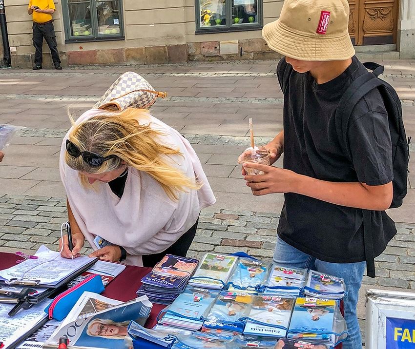 当天来听真相的有不少年轻人,两位二十多岁的瑞典姑娘站在真相展板前仔细阅读、观看,然后想了解更多的详情,又和学员交谈了很久。俩人对中共迫害法轮功、活摘法轮功学员器官的残暴行径非常愤怒。她们一起走到签字簿前签字,其中的一位姑娘是半跪着,庄重的写下了自己的名字,以此来表达自己对早日停止迫害法轮功的心愿。