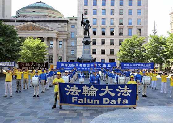 来自魁北克省和安大略省的部份法轮功学员8月8日在蒙特利尔老城的兵器广场集会,声援3.6亿中国人退出中共党、团、队。