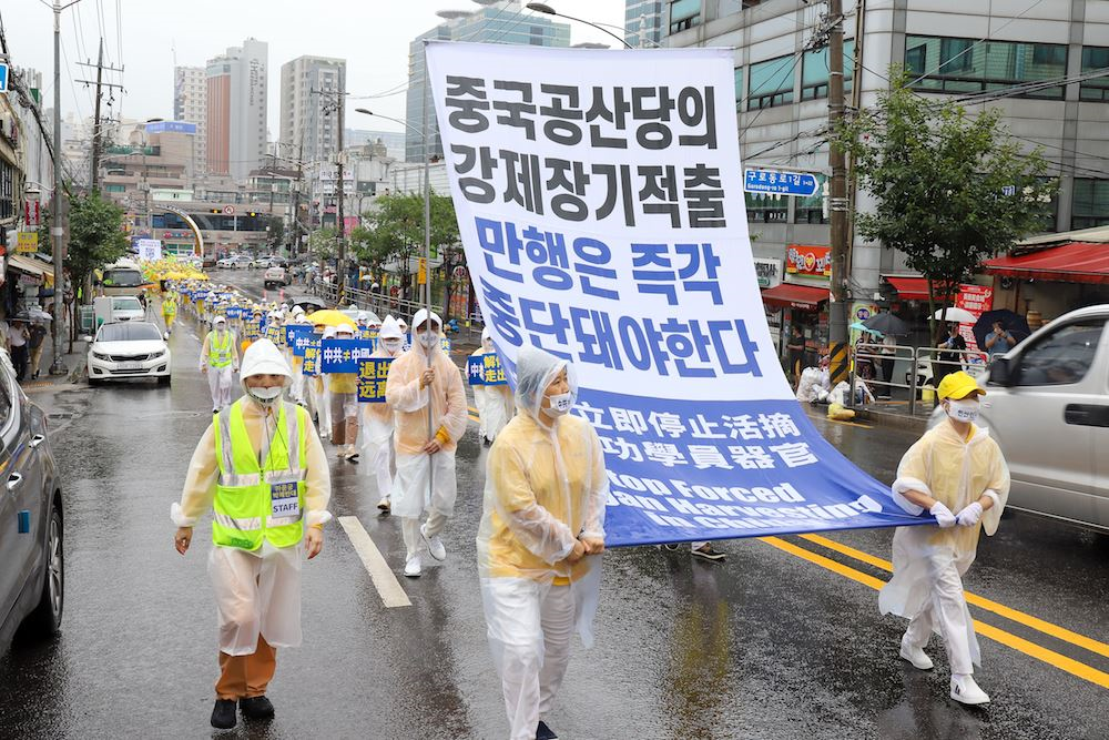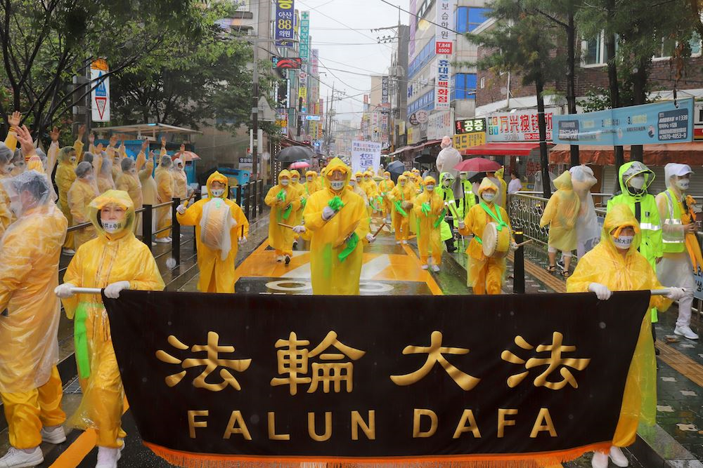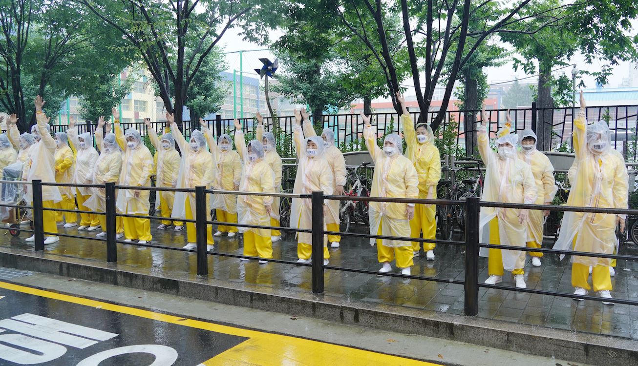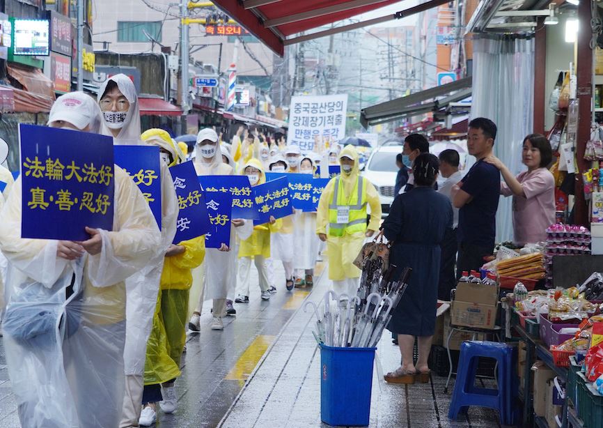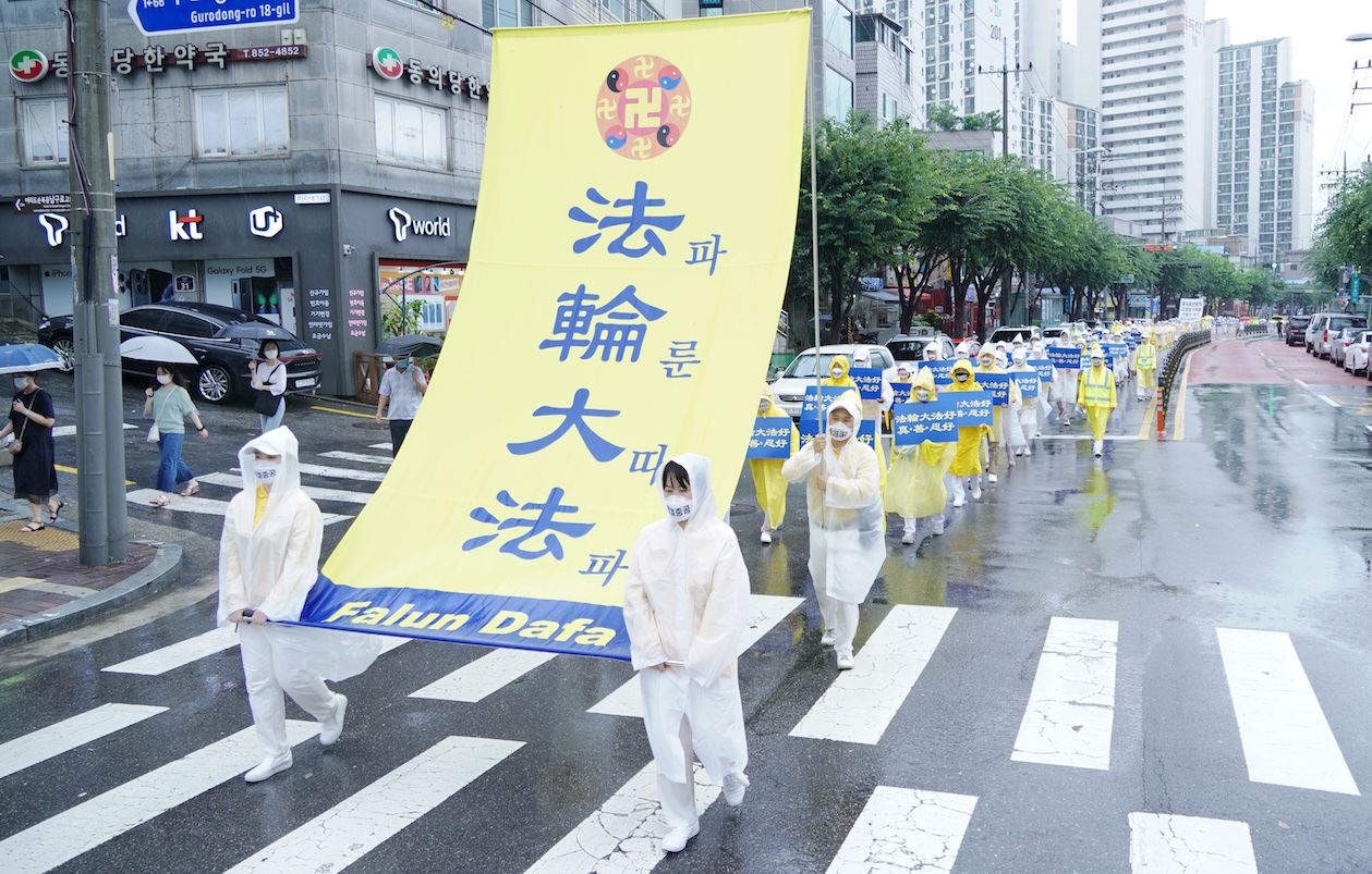 九日上午十点开始,约五百名来自首尔及周边地区的法轮功学员,在首尔九老儿童公园集会,随后冒大雨沿着韩国最大的中国城大林洞一带游行两个小时,向当地的中国人和韩国人传递了“退出中共,远离瘟疫”等讯息,为因挥之不去的瘟疫和雨灾而内心忧郁沉闷的人们带来光明和希望
