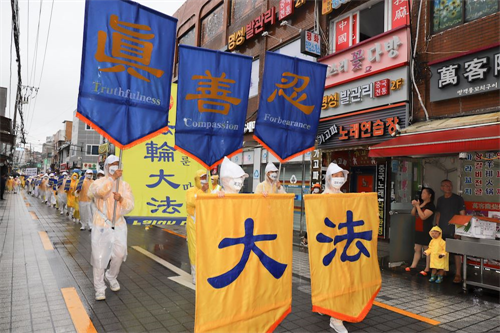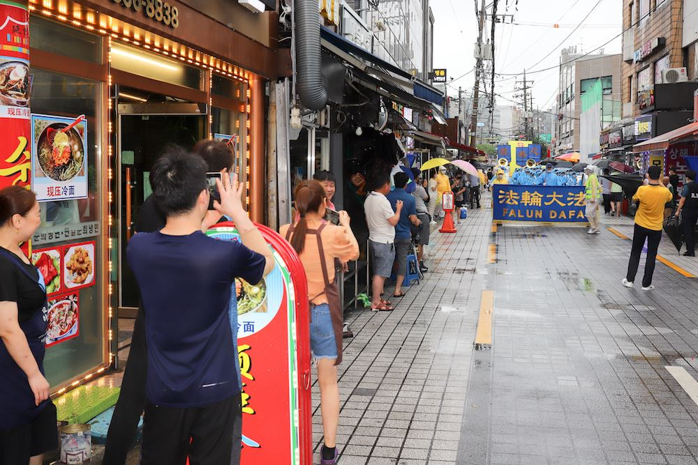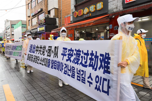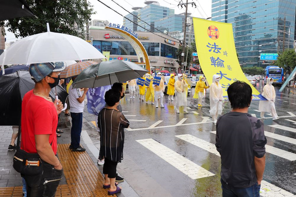 【明慧网二零二零年八月十二日】“法轮功来了!”“法轮功来了!”二零二零年八月九日上午,韩国最大的中国城首尔大林洞一带,许多中国人在大雨中奔走相告,备受震撼。人们纷纷驻足,聚精会神地观看着由韩国法轮功学员组成的声势浩大的退党游行队伍。