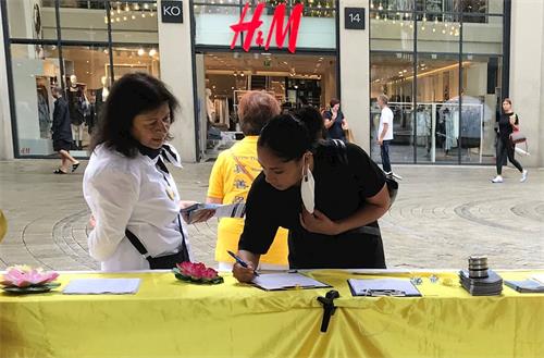 还有不少路人直接到信息台前签名支持制止迫害,西比勒(Sibylle)女士就是其中的一位。她曾看过揭露中共活摘器官的纪录片,了解法轮功学员遭受的非人折磨。她称赞学员:“你们做了一件非常对的事!非常好!”临走时她还送上祝福:“祝你们成功! ”