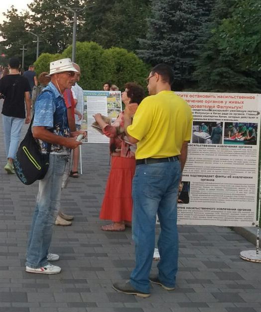 六十三岁的居民根纳基说,以前见过法轮功举办活动,有学员给他发过报纸。他在家里照着报纸上的炼功图自己学动作。学了几个动作,他感受到一股强烈的力量猛灌,心情也随之格外愉悦。二十四日当天,根纳基走来询问学员,又要了两份报纸,他要给他的姐姐和女儿。他补充说道,他们三个人都想到炼功点上学法轮功。