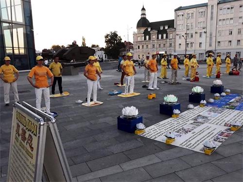 哈尔科夫市法轮功学员也参加了庆祝活动,向市民和游客展示功法,派送小莲花,并表演腰鼓,和民众共度美好节日。