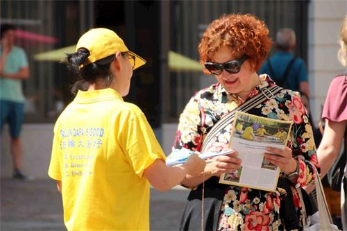 她希望通过签名:“能够有一个转折,能够有足够的签名,能在媒体上有相关(揭露迫害)的报道,能让更多人知晓(真相),因为在媒体上看不到相关的讯息。”她谈到法轮功学员:“虽然你们是志愿者,但是你们全身心投入。希望他们(受迫害的法轮功学员)的生活能够得到改变,能够有效果,祝你们好运!”