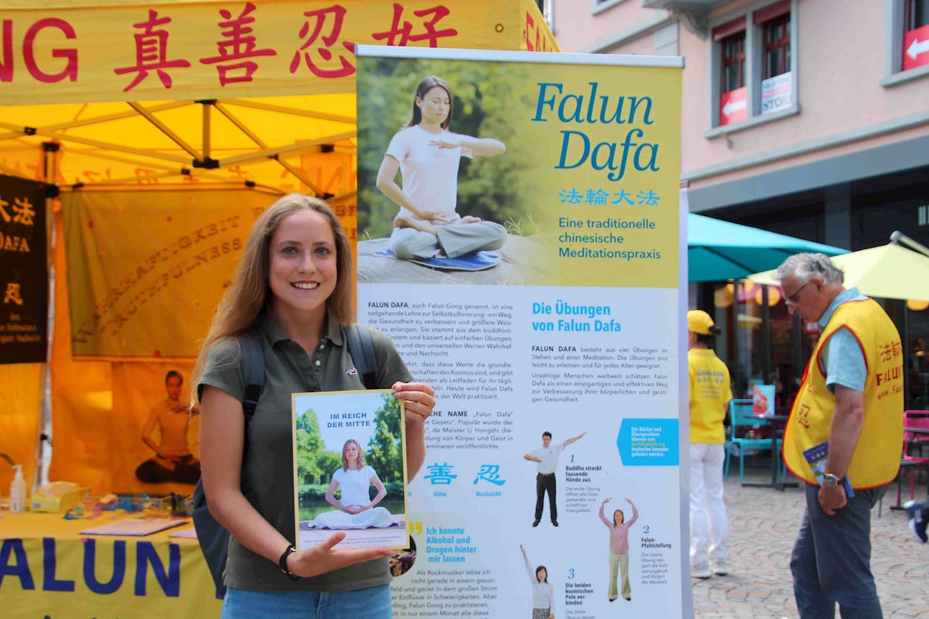 【明慧网二零二零年八月三十日】二零二零年八月二十四日,瑞士卢塞恩市(Lucerne)的法尔肯广场(Falkenplatz)再次出现一个金黄色的帐篷,上面写着醒目的“法轮大法”以及中文的“法轮大法好”,“真善忍好”。很多路人在经过时会念出声来,有的驻足观看展出的大法弘传世界照片及介绍大法美好,揭露中共迫害法轮功的展板。有的在和学员交谈后签名支持法轮功,要求瑞士政府出力制止中共活摘法轮功学员器官的罪行。他们中有的是第一次听说法轮功,也有的曾看到过法轮功学员多年来在该市景点定期举办的信息摊位,因此早已了解法轮功。