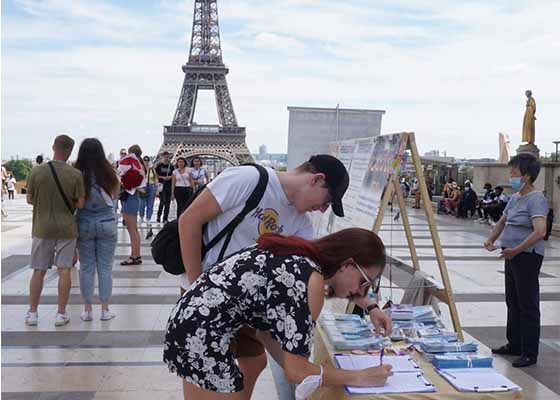 八月二日下午,虽然法国防疫工作仍然没有放松,但是巴黎人权广场上今天却是人潮涌动。游人们经过巴黎法轮功学员在这里的讲真相展台前,会不由自主地停下脚步观看展板或学员的功法演示。