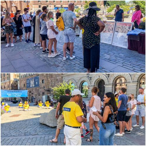 二零二零年八月八日周六中午,骄阳似火,是瑞典首都斯德哥尔摩市进入八月份最热的一天。虽然天气炎热,但法轮功学员仍一如既往的在斯德哥尔摩市中心国会大厦(Riksdag)旁的钱币广场(Mynttorget)举办讲真相活动,揭露中共谎言,曝光中共活摘法轮功学员器官牟利的罪恶。他们希望更多的瑞典民众了解法轮功真相,有一个美好的未来。