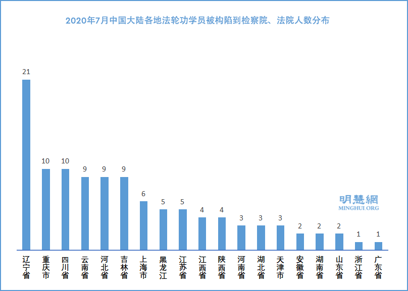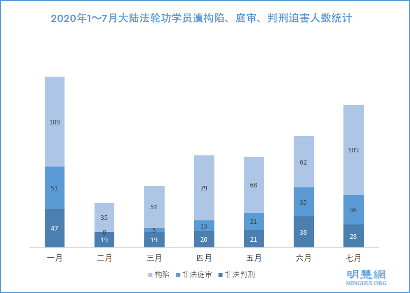 ![]() 图:2020年1~7月大陆法轮功学员遭构陷、庭审、判刑迫害人数统计 |
