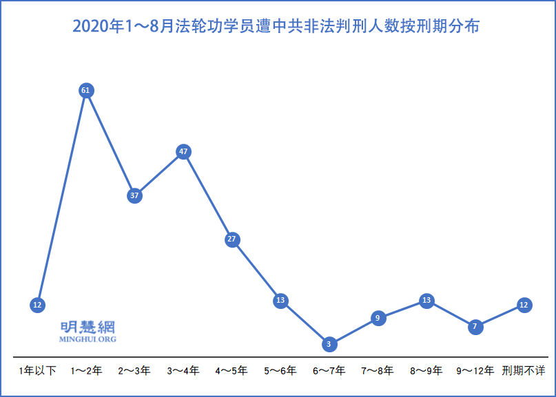 ![]() 图1:2020年1~8月法轮功学员遭中共非法判刑人数按刑期分布 |