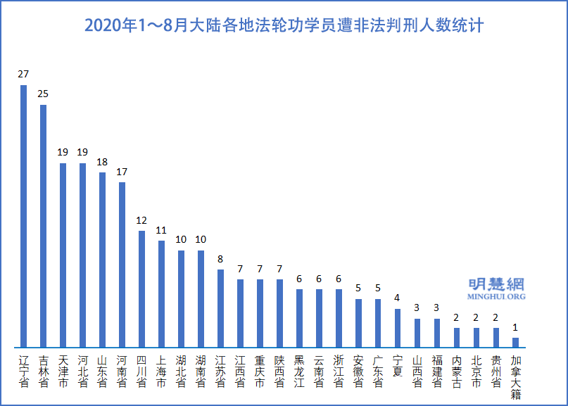 ![]() 图3:2020年1~8月大陆各地法轮功学员遭非法判刑人数统计 |