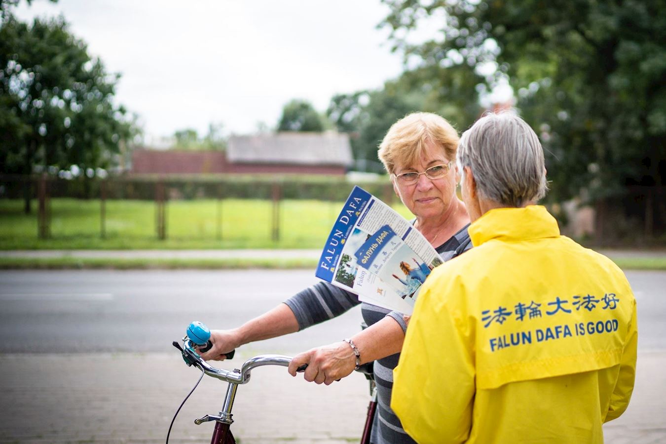 在Kauguri活动地点,有位已了解法轮大法并签署了请愿书的女士,询问一位学员,“告诉我,您是怎么了解这个功法的?”学员告诉她,当自己脊椎出了问题有可能得坐轮椅时,在利耶帕亚(Liepaja),她遇到法轮功学员,当时法轮功学员正在罗祖广场(Rožu Square)举行活动。了解了之后,她觉得这个功法很好,从那以后,她开始修炼法轮功。“在修炼过程中,我脊椎上的毛病逐渐消失了,视力也得到了很大的提高。”她说,谈话快结束时,那位女士表示,“如果这个功法让您那么满意,我知道,我也会喜欢的。”