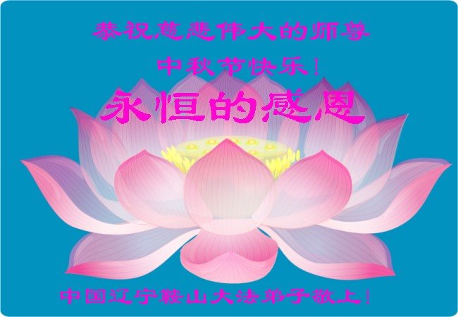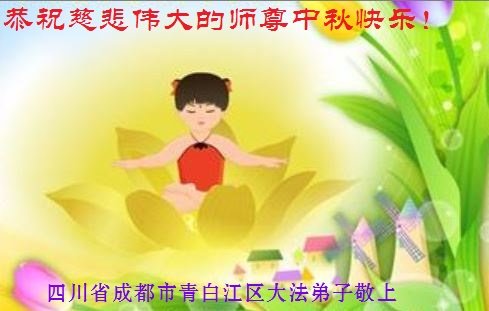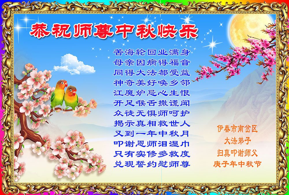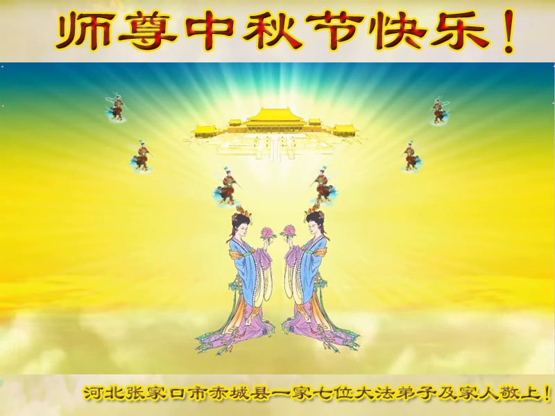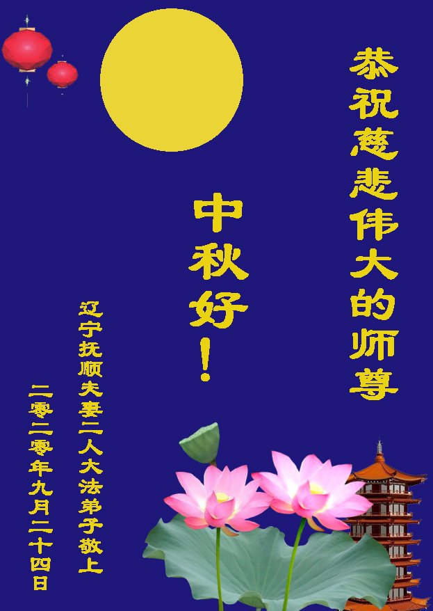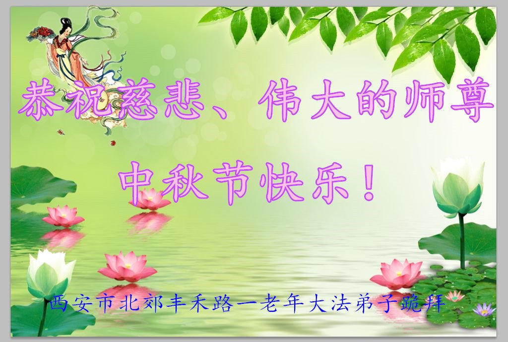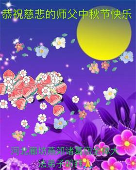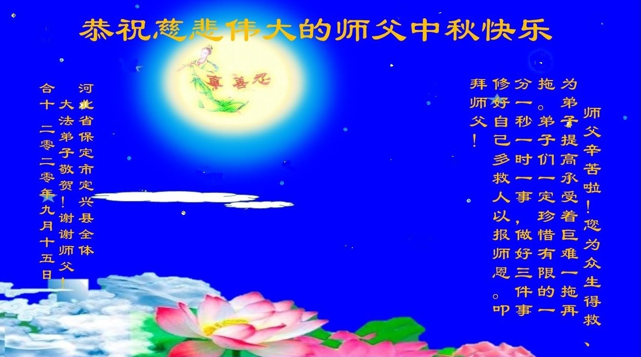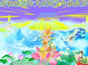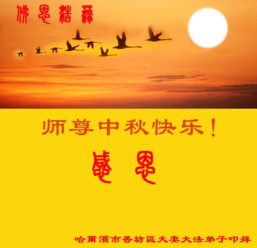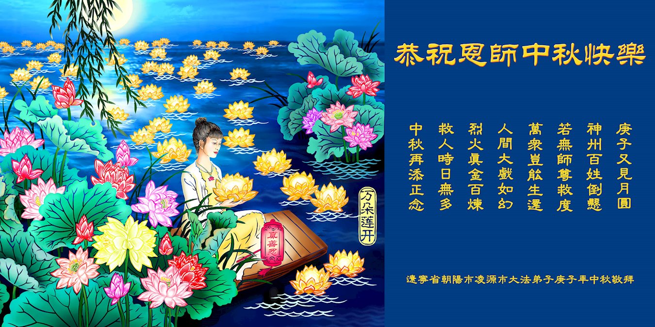 中国民众在贺词中写道:在中秋节来临之际,感恩大法师父的慈悲保护!我们盼望您早日回归中土,恩泽百姓,让亿万个家庭解开中共的枷锁,让中华民族五千年的文明在中原再现。