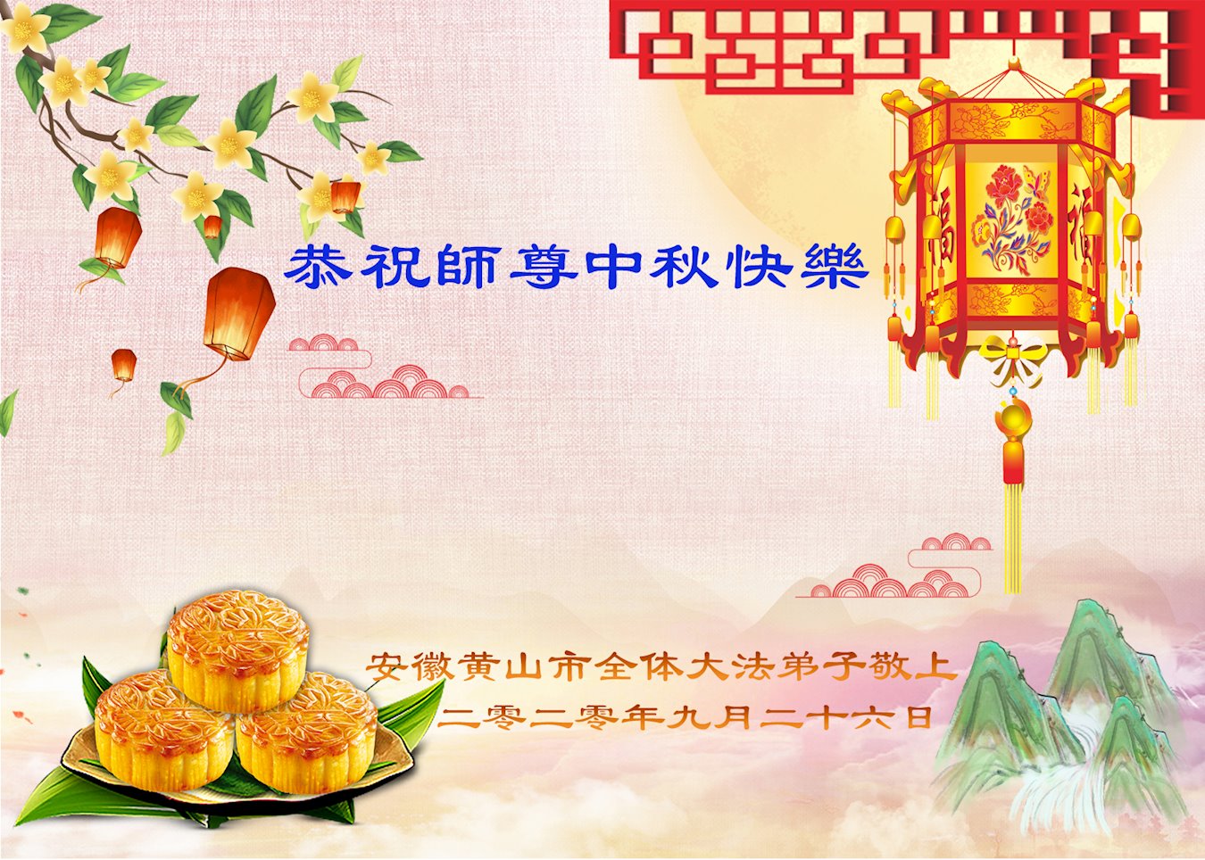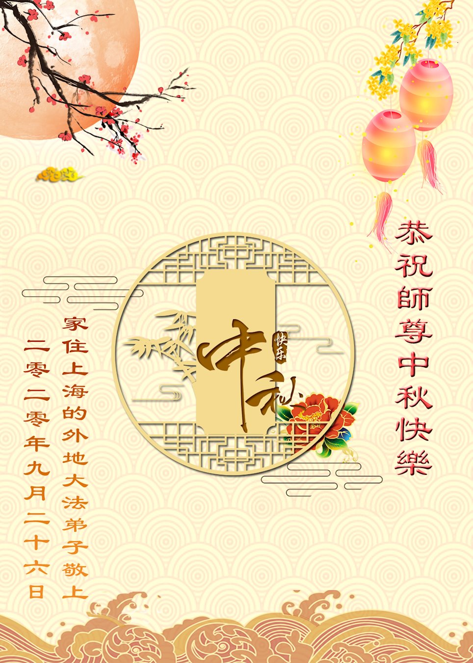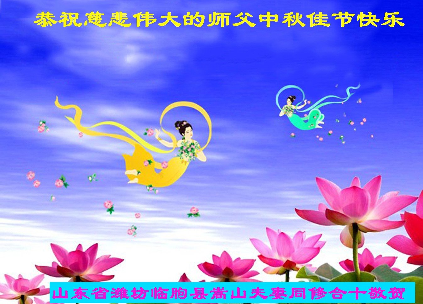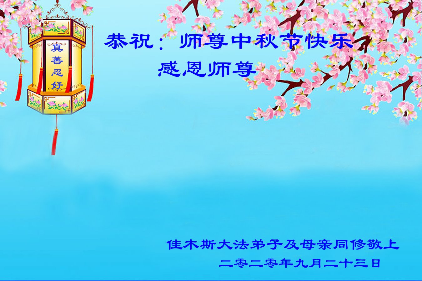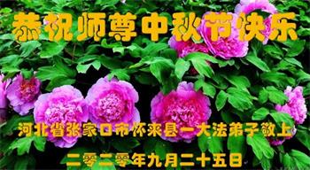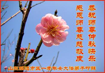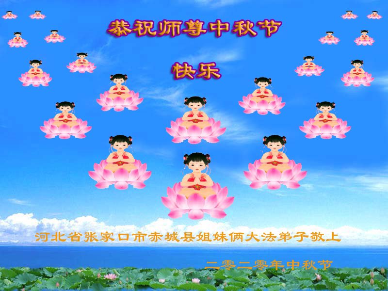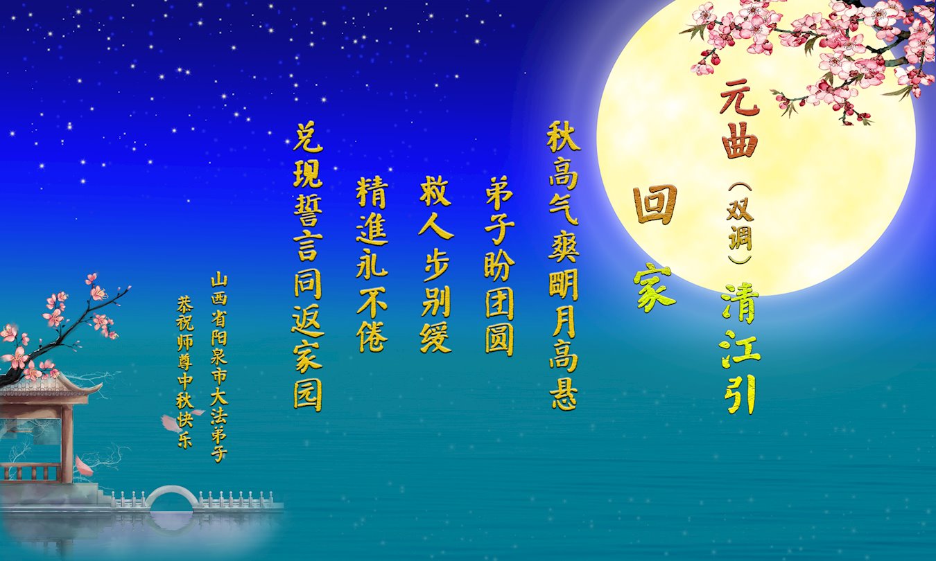 中国民众在贺词中写道:在中秋节来临之际,感恩大法师父的慈悲保护!我们盼望您早日回归中土,恩泽百姓,让亿万个家庭解开中共的枷锁,让中华民族五千年的文明在中原再现。