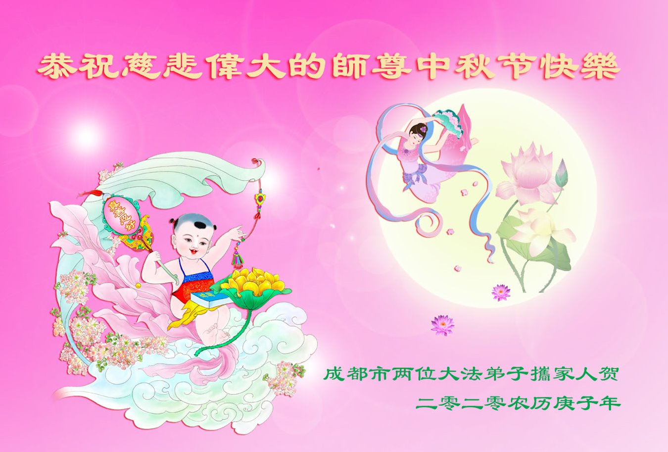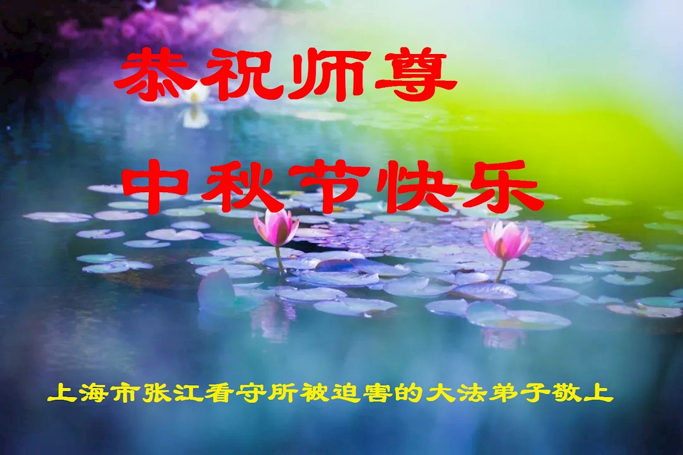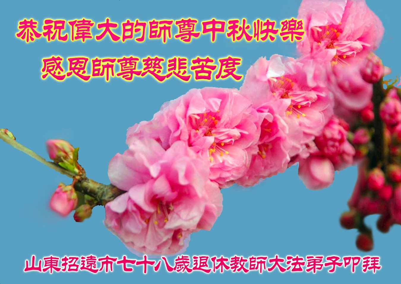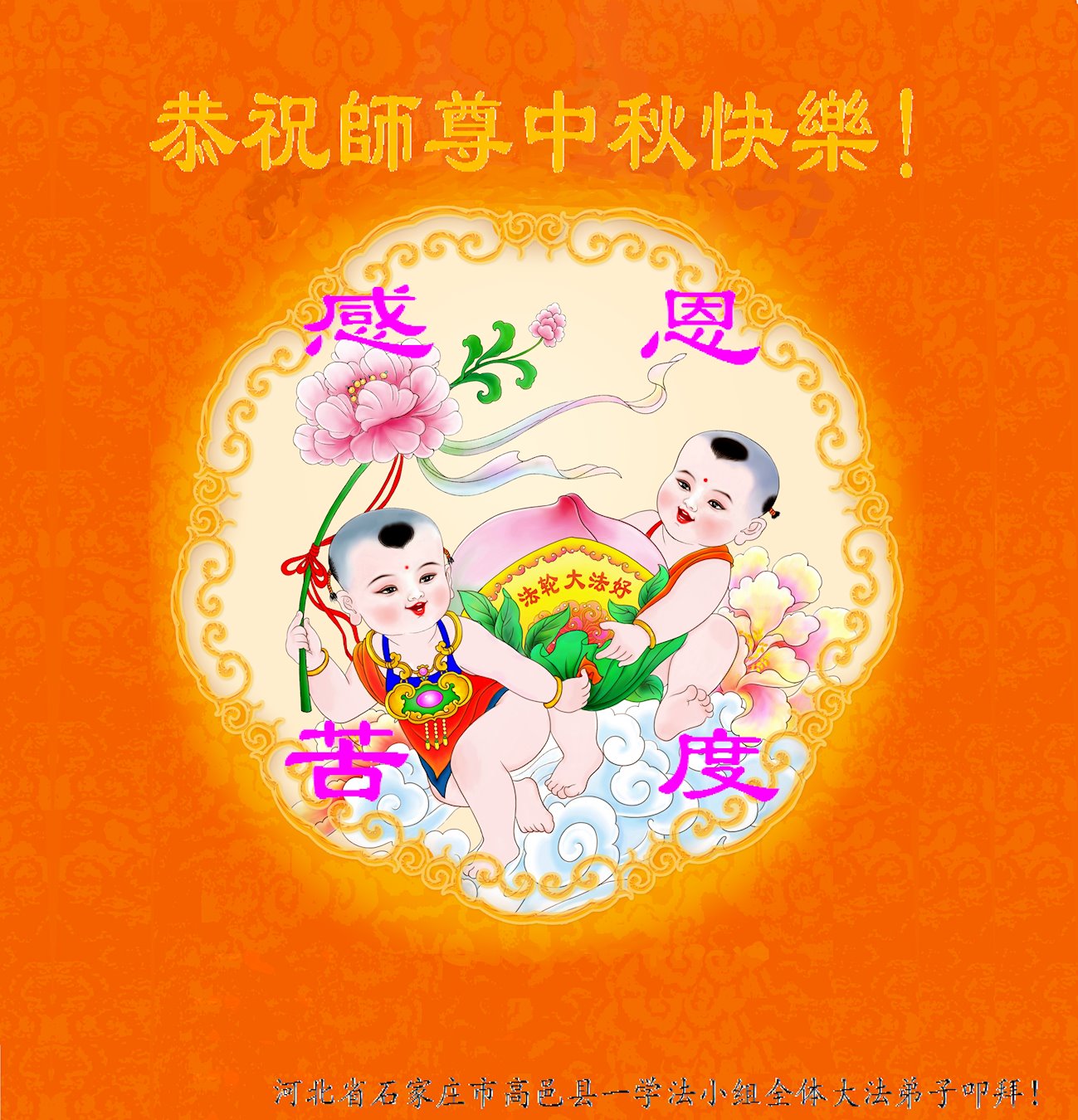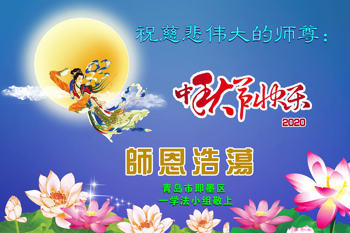 中国民众在贺词中写道:在中秋节来临之际,感恩大法师父的慈悲保护!我们盼望您早日回归中土,恩泽百姓,让亿万个家庭解开中共的枷锁,让中华民族五千年的文明在中原再现。