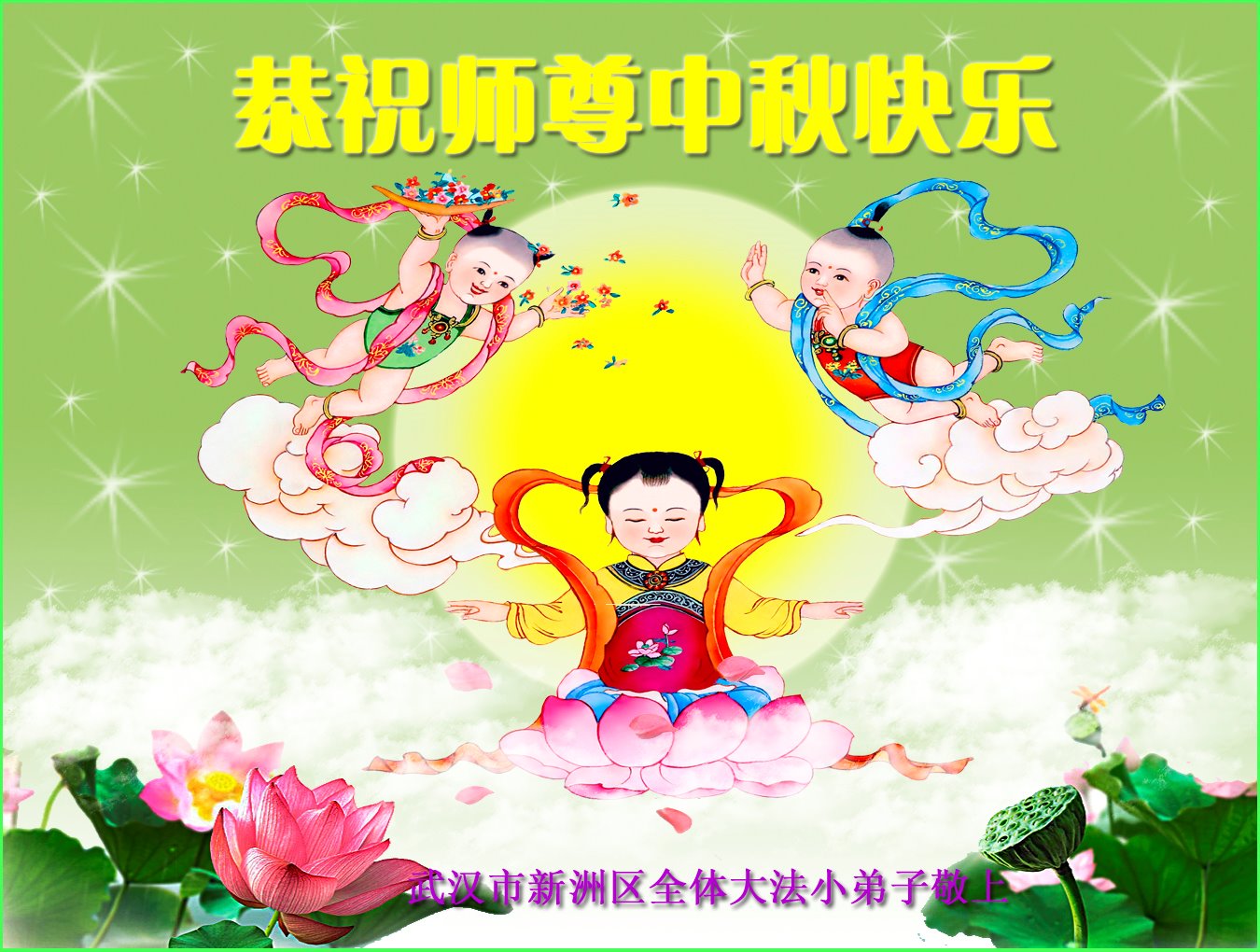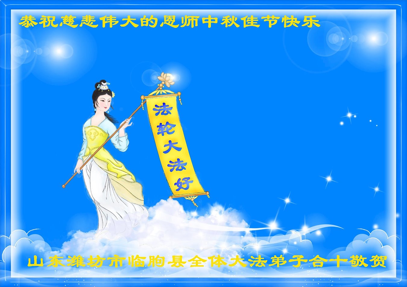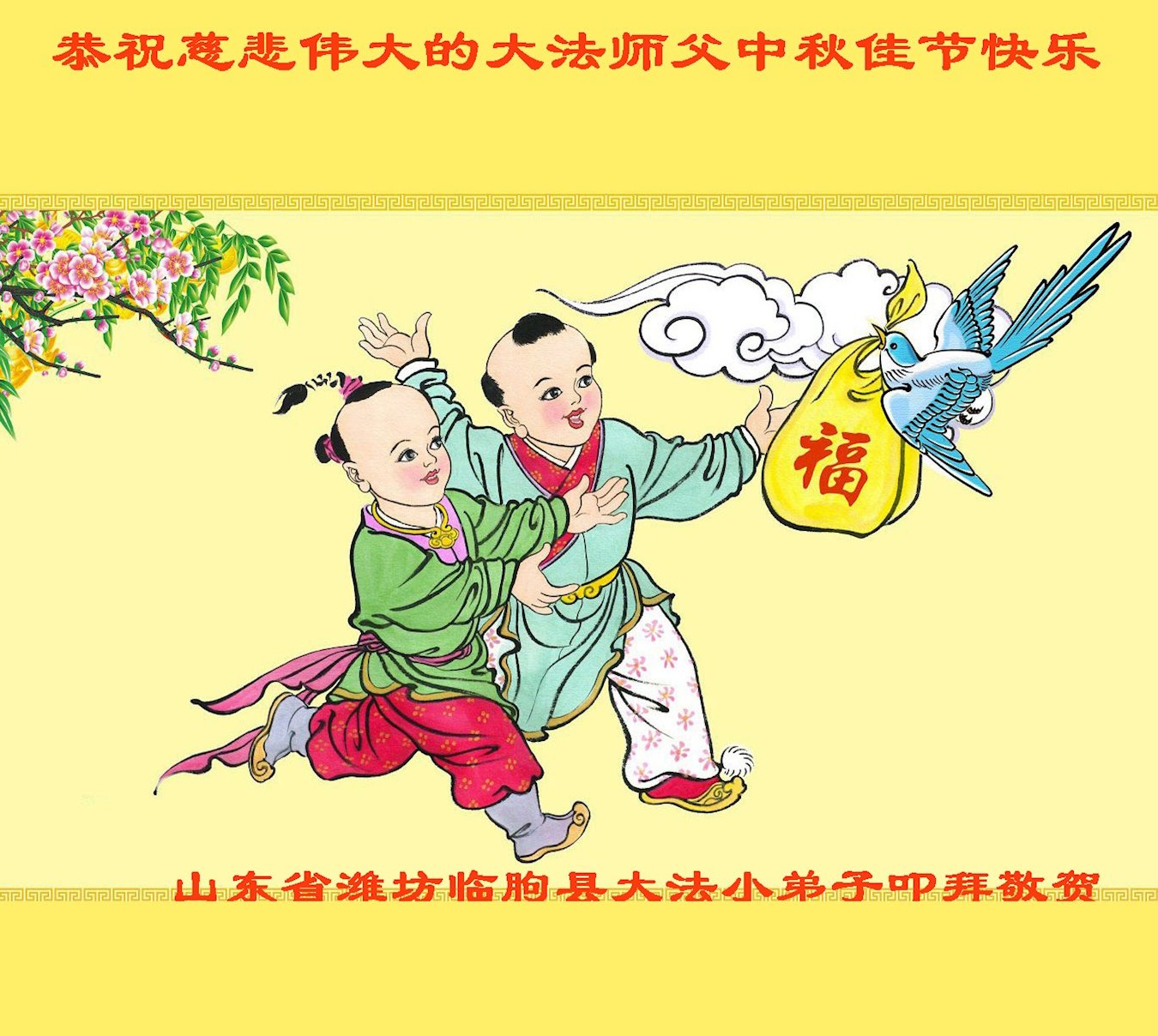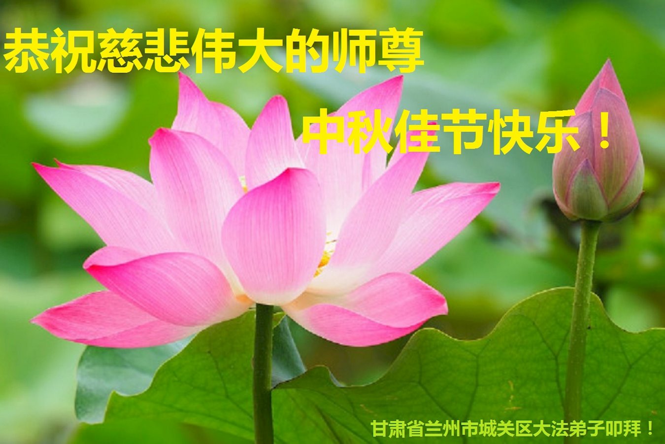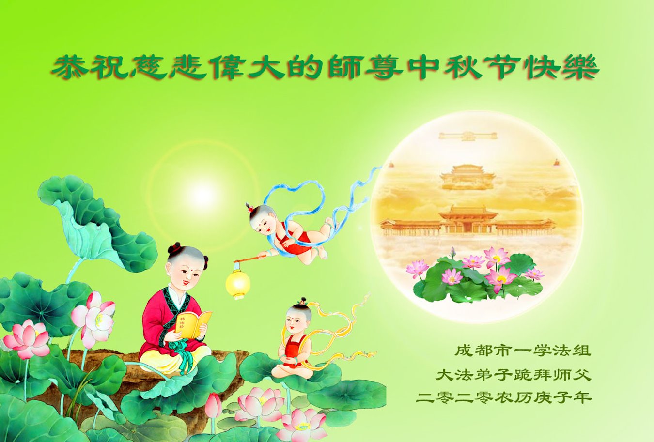 中国民众在贺词中写道:在中秋节来临之际,感恩大法师父的慈悲保护!我们盼望您早日回归中土,恩泽百姓,让亿万个家庭解开中共的枷锁,让中华民族五千年的文明在中原再现。