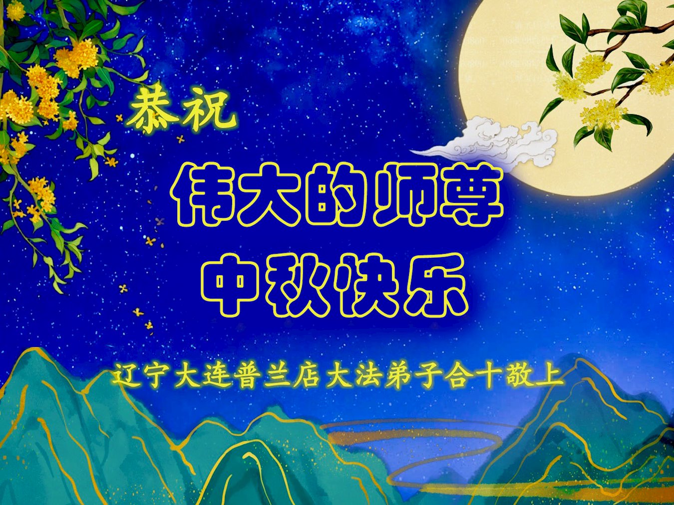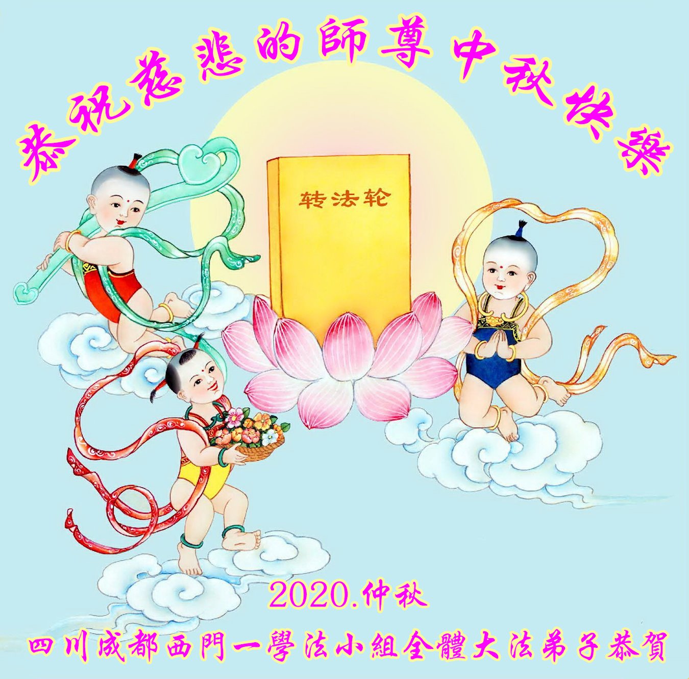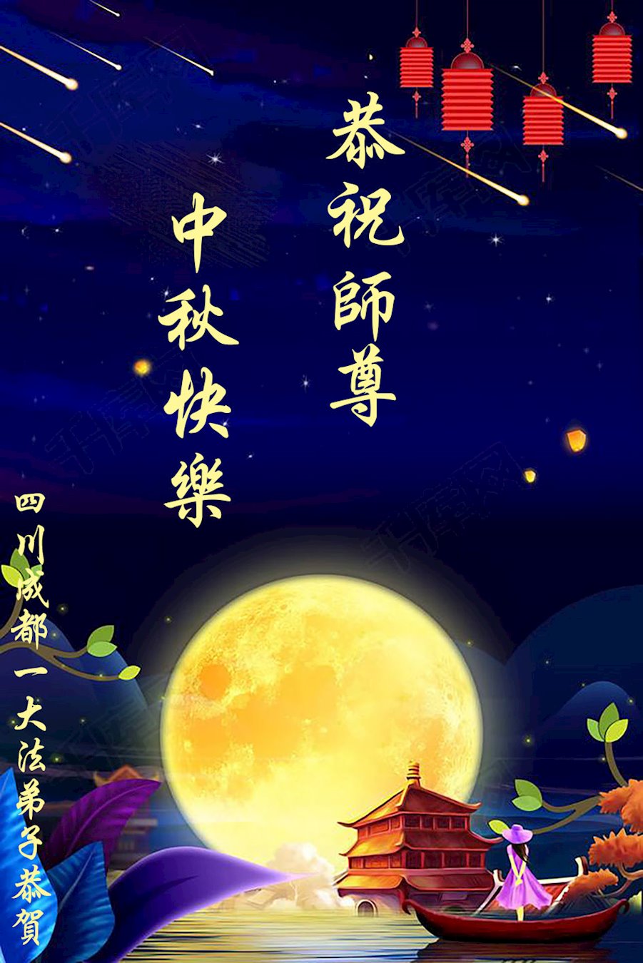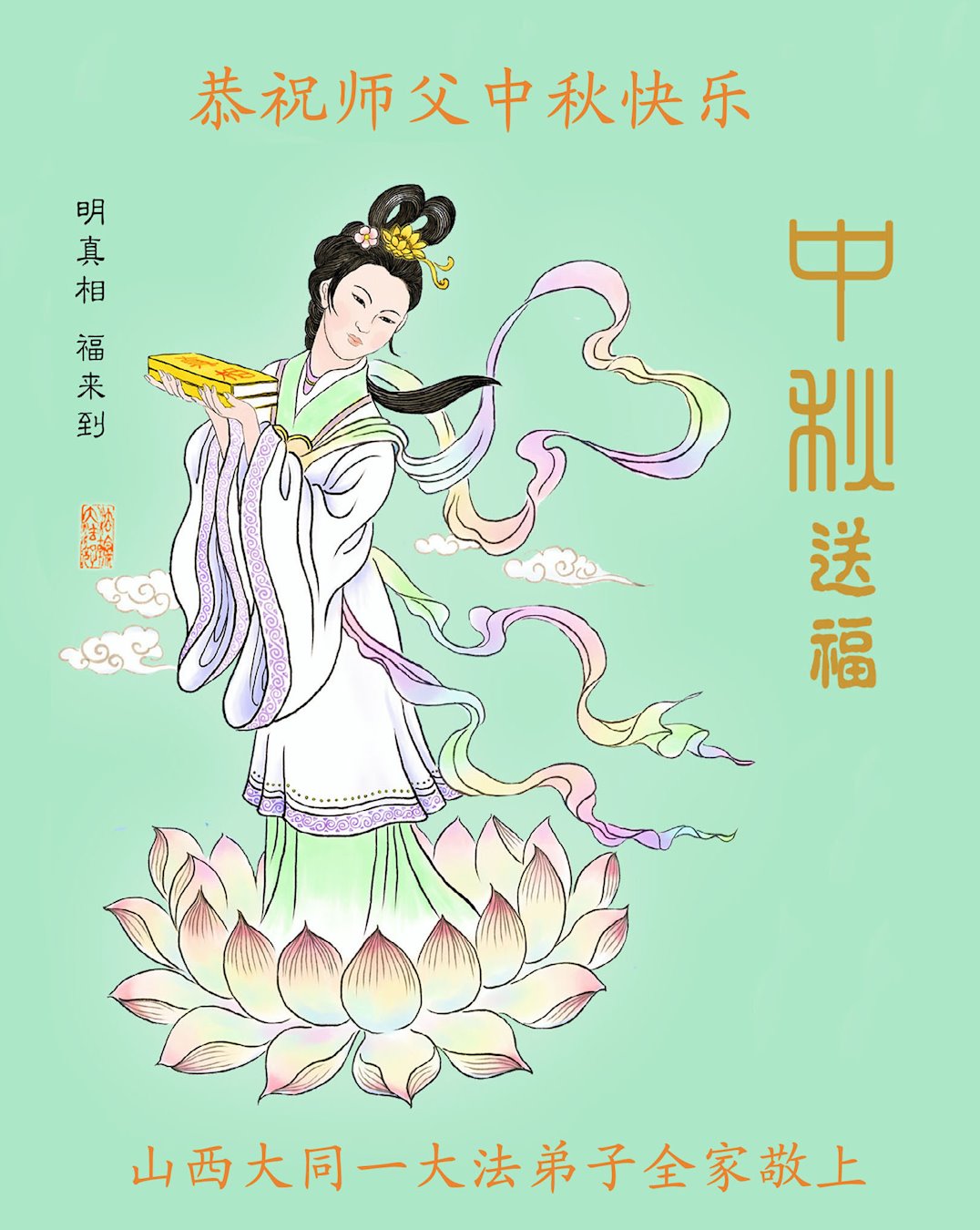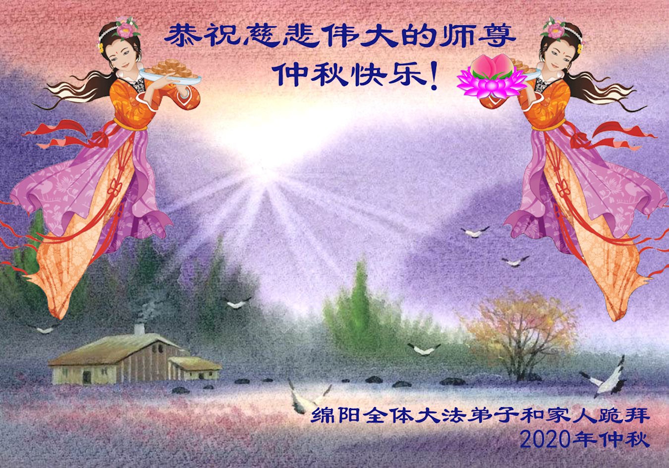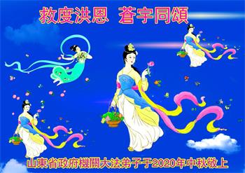 中国民众在贺词中写道:在中秋节来临之际,感恩大法师父的慈悲保护!我们盼望您早日回归中土,恩泽百姓,让亿万个家庭解开中共的枷锁,让中华民族五千年的文明在中原再现。