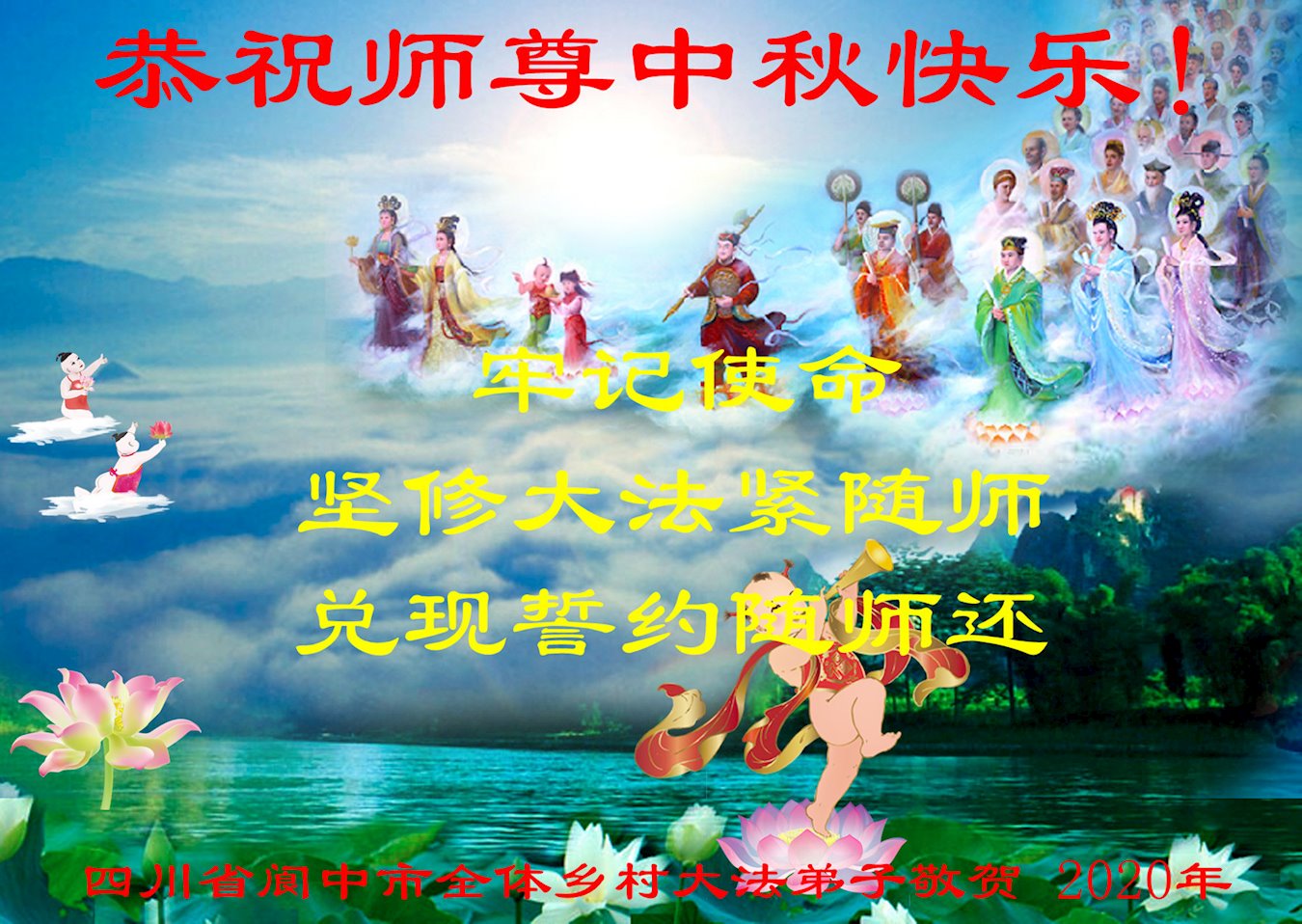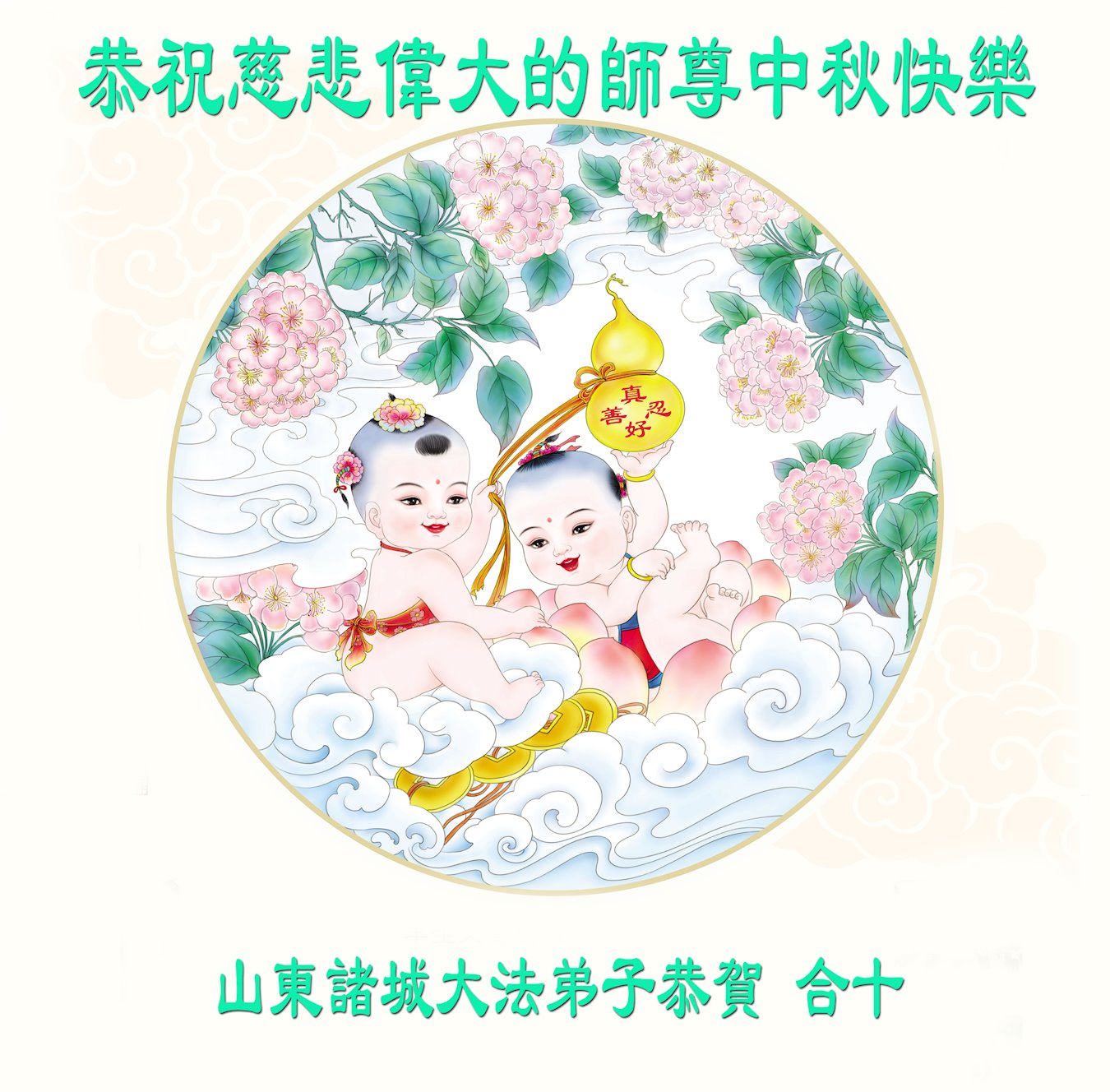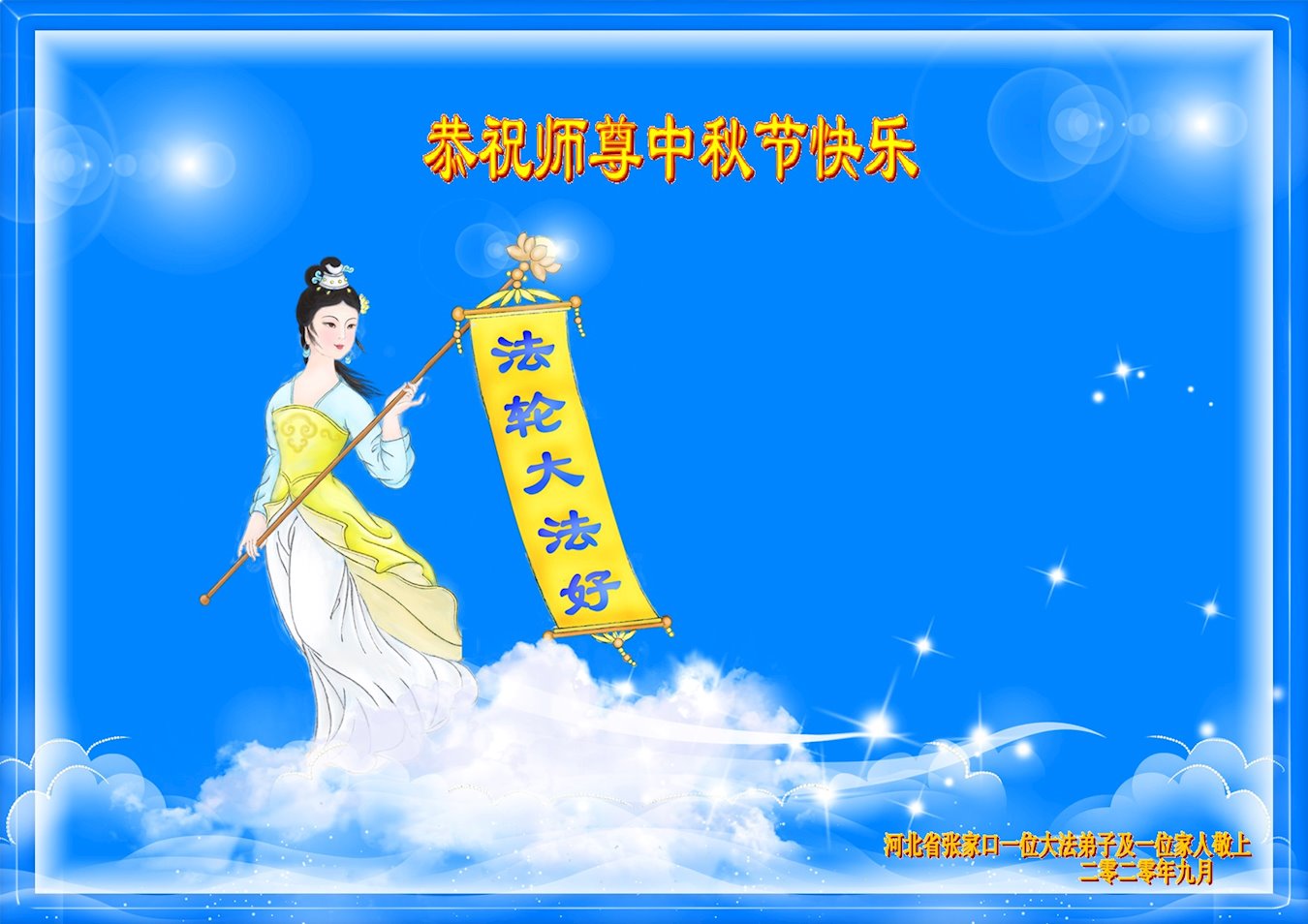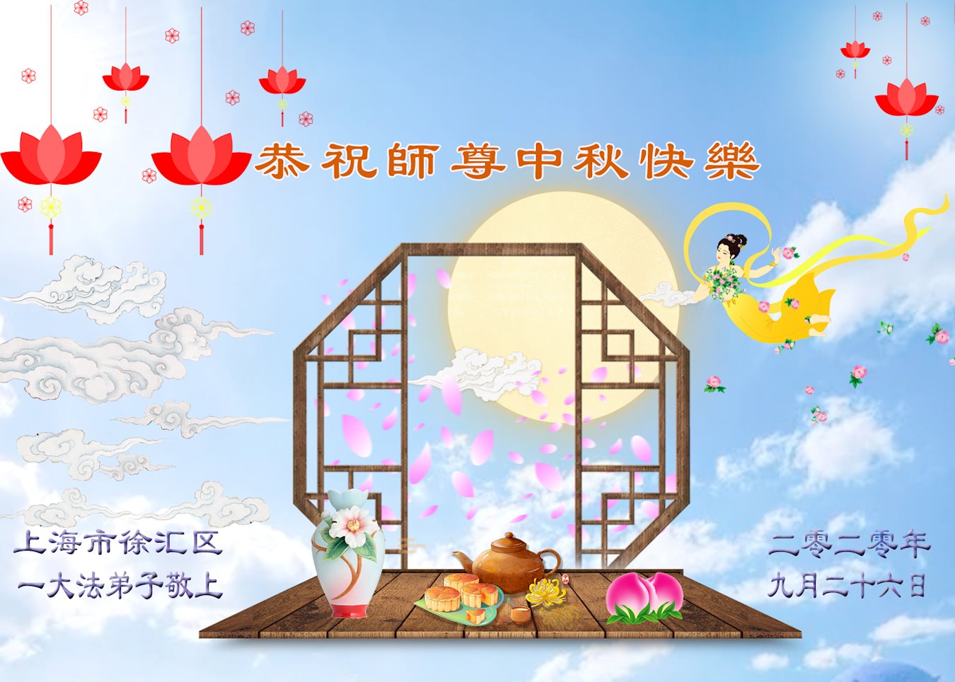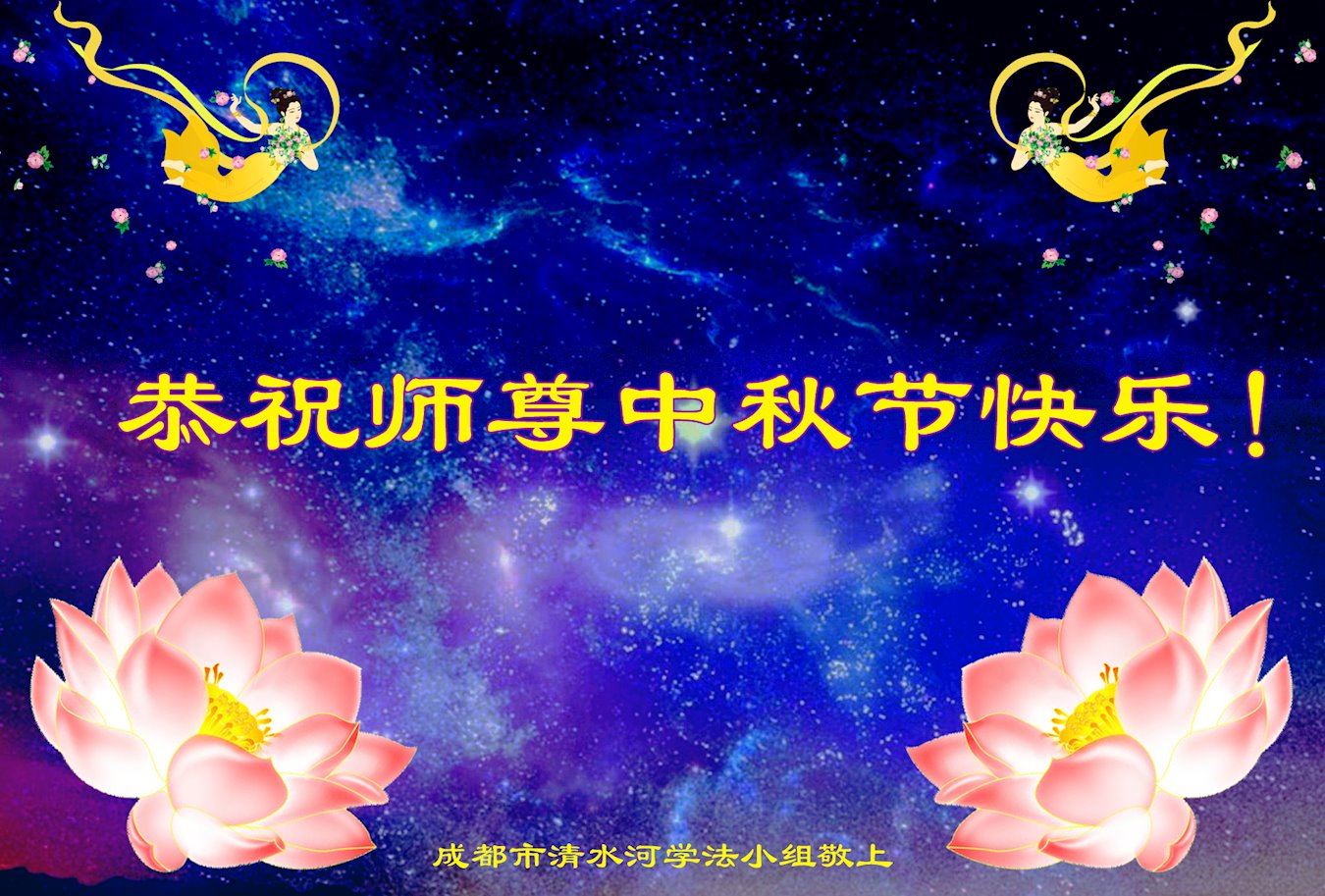 中国民众在贺词中写道:在中秋节来临之际,感恩大法师父的慈悲保护!我们盼望您早日回归中土,恩泽百姓,让亿万个家庭解开中共的枷锁,让中华民族五千年的文明在中原再现。