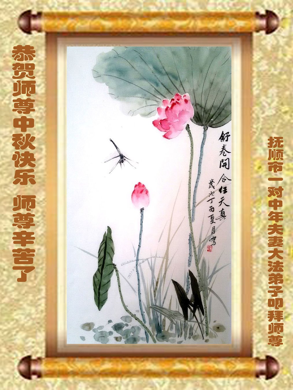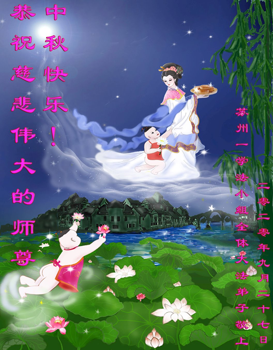 在此我们全家在中秋节来临之际,感恩大法师父的慈悲看护!恭祝大法师父中秋节快乐!
