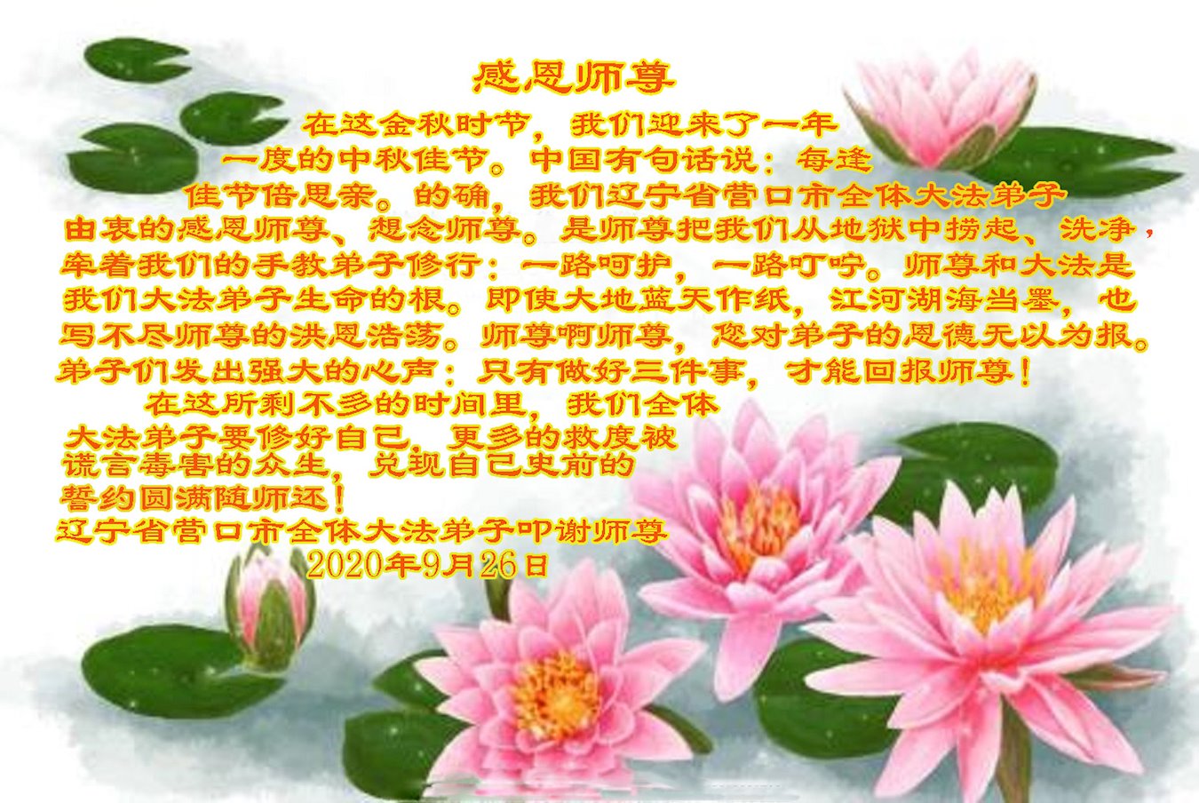 <英文版: http://en.minghui.org/html/articles/2020/9/30/187044.html>长春家乡百姓祝福法轮功李大师中秋节好