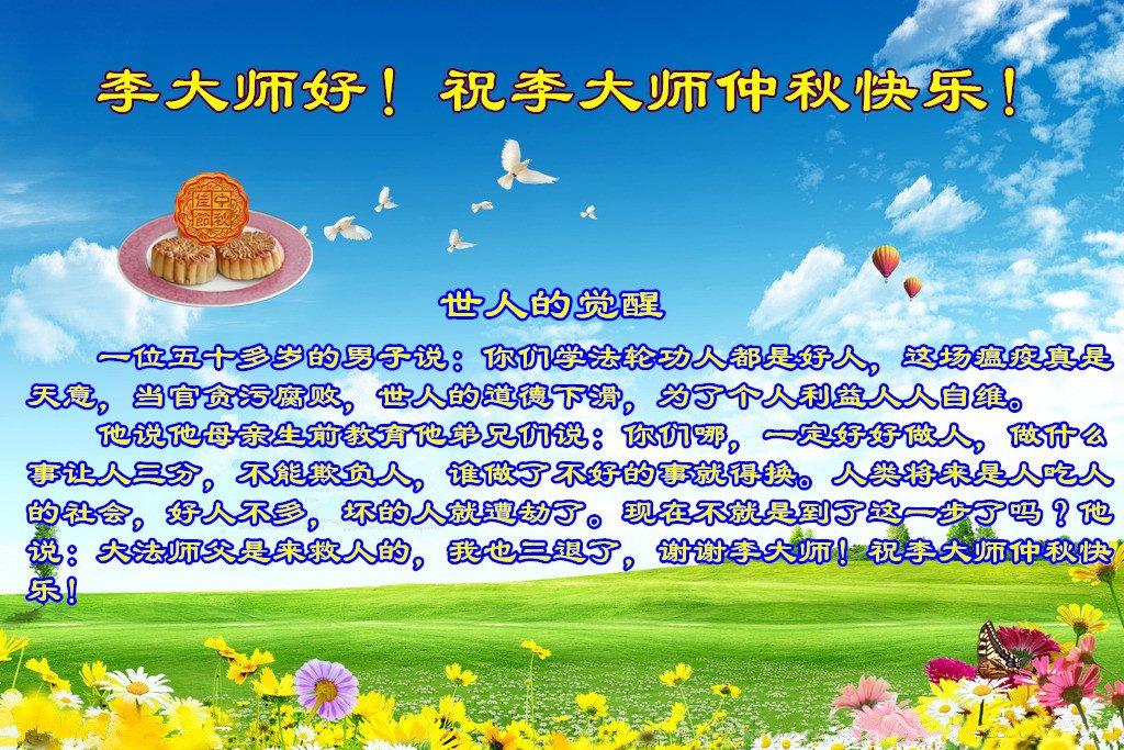 他说:大法师父是来救人的,我也三退了,谢谢李大师!祝李大师中秋快乐!