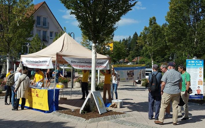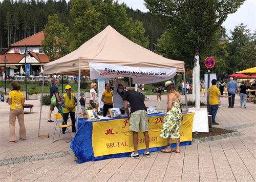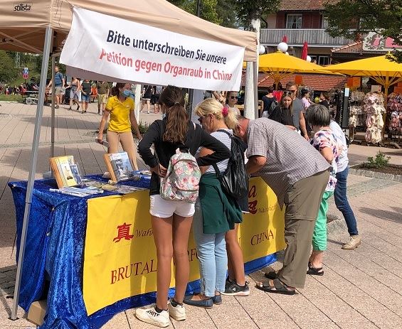 【明慧网二零二零年九月八日】二零二零年九月五日,法轮功学员再次来到德国南部黑森林里的缇缇湖(Titisee)景区,向来自各国的游客讲述中共迫害法轮功的真相,并征集签名,制止中共活摘器官的恶行。