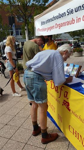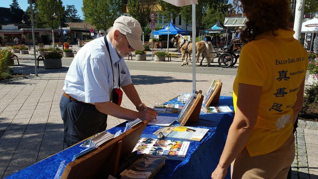 来自德国的沃格特(Vogt)先生径直来到信息台前,表示要签名。他是第一次听说在中国发生了活摘器官这样的事情。他表示作为一名医生,很容易明白这是怎么一回事。在签名表上签下自己的姓名、地址后,他禁不住为这个世界上竟发生了这样邪恶的事情而感叹道:“我们生活在一个很美但很糟糕的世界。”