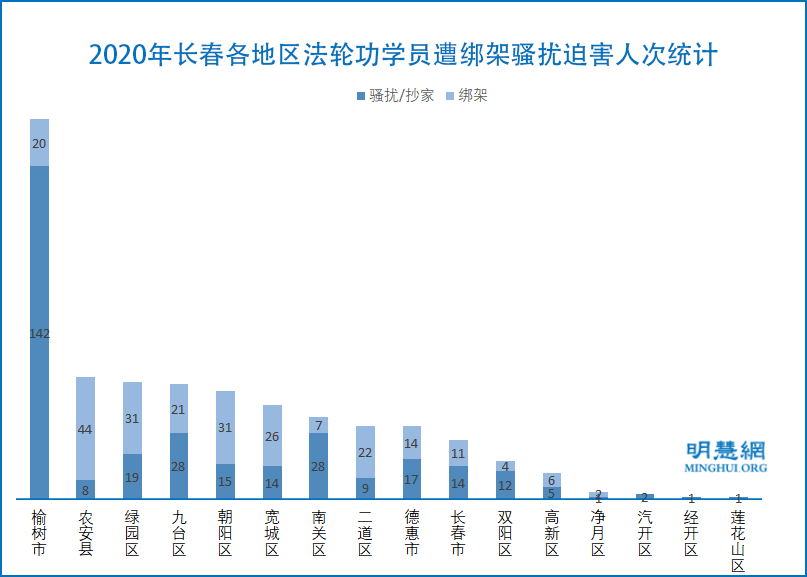 ![]() 图2:2020年长春各地区法轮功学员遭绑架骚扰迫害人次统计 |
