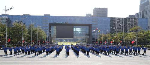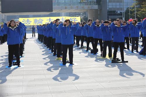 图2~4:二零二一年一月一日,大台中地区的法轮功学员在市政府广场上集体炼功。悠扬炼功乐声响起,学员展示五套功法缓、慢、圆的整齐动作,殊胜祥和的壮观场面,吸引过往行人的目光。
