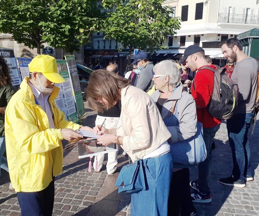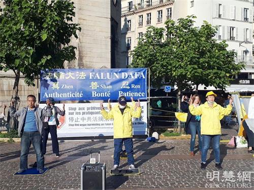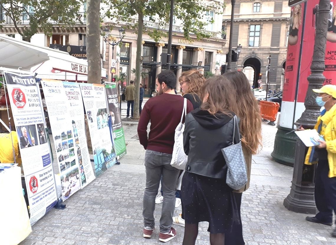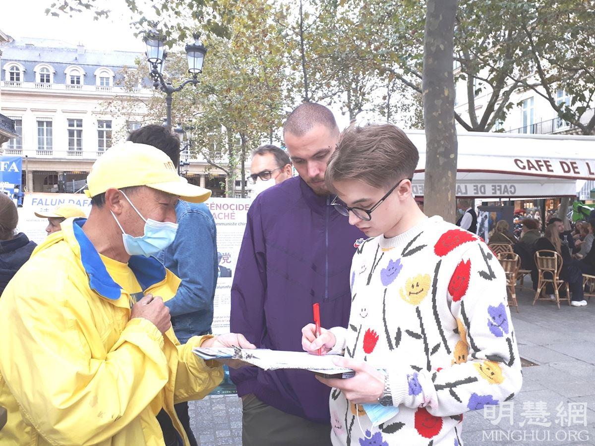 十月九日下午,秋高气爽,法轮功学员举办的真相日活动,在巴黎最大的地铁站夏特蕾站门前广场进行,这里人潮如流。人们有的停下脚步,接受法轮功传单和真相报,有的观看法轮功学员炼功,有的人阅读展板,提出问题。巴黎民众了解到法轮功学员仅仅因为修炼真、善、忍就遭到中共迫害,甚至被强摘器官,都感到震惊、愤慨,纷纷在征签表上签字,希望制止中共暴行。人们纷纷赞扬法轮功学员不畏强暴的勇气和坚持,希望法轮功学员早日获得自由和平的修炼环境。