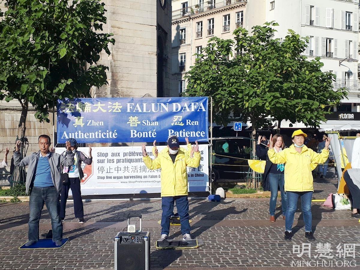 ![]() 图7:二零二一年十月二日,法轮功学员在巴黎柯莱特广场演示法轮功功法。 |