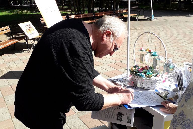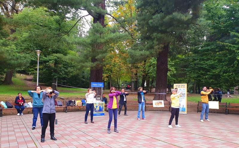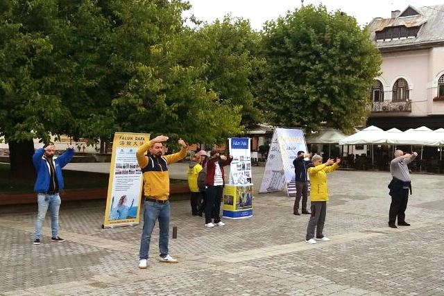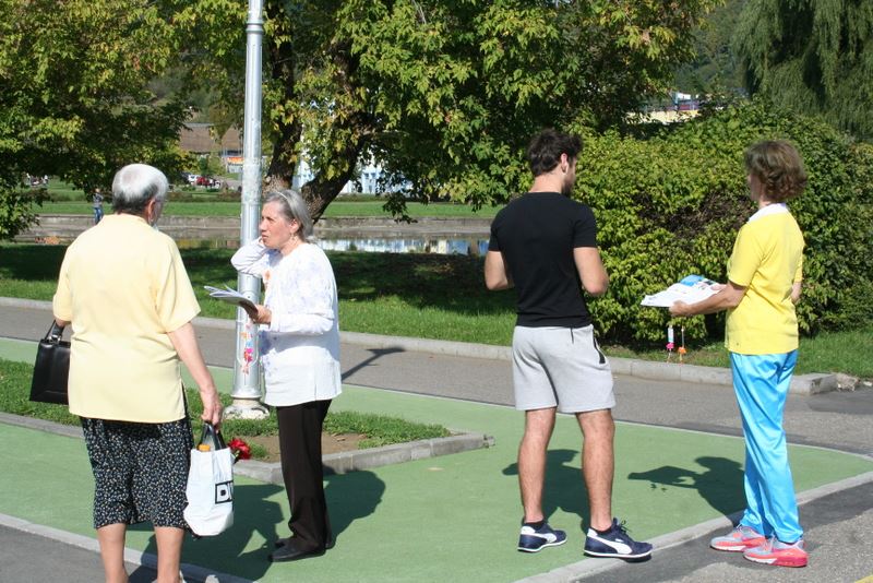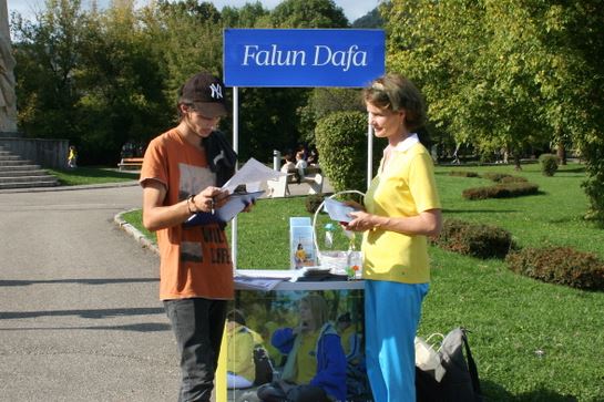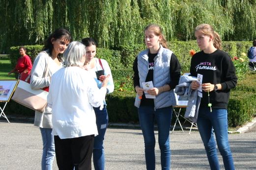 一位老太太看到法轮功的横幅和功法演示,脸上顿时亮了起来。她问了学员许多问题,并很高兴得知周日在拜亚马雷有炼功活动。她表示,这种展现道德价值观和人类传统文化之美的活动,如今越来越少见。